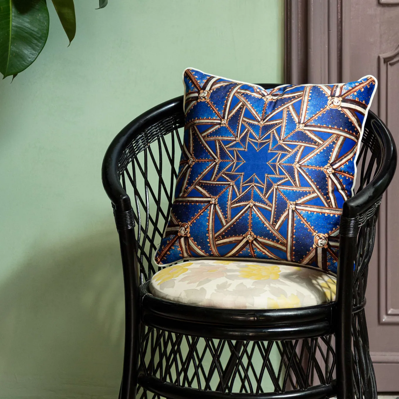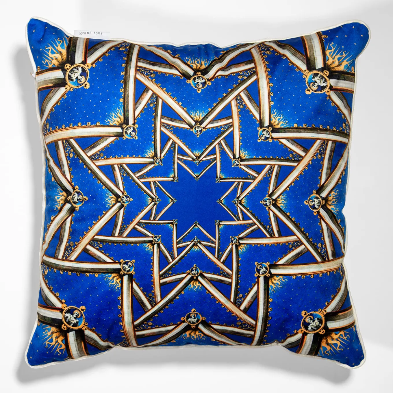 Questo cuscino fa parte della Collezione “Le Volte Celesti”, che crea, attraverso l’utilizzo di alcuni bozzetti storici di affreschi dedicati alle navate del Duomo, dei giochi geometrici, quasi caleidoscopici. L’onore di aver potuto lavorare su questi materiali preziosi, oggi mai visti, rende questo progetto unico ed emozionante.