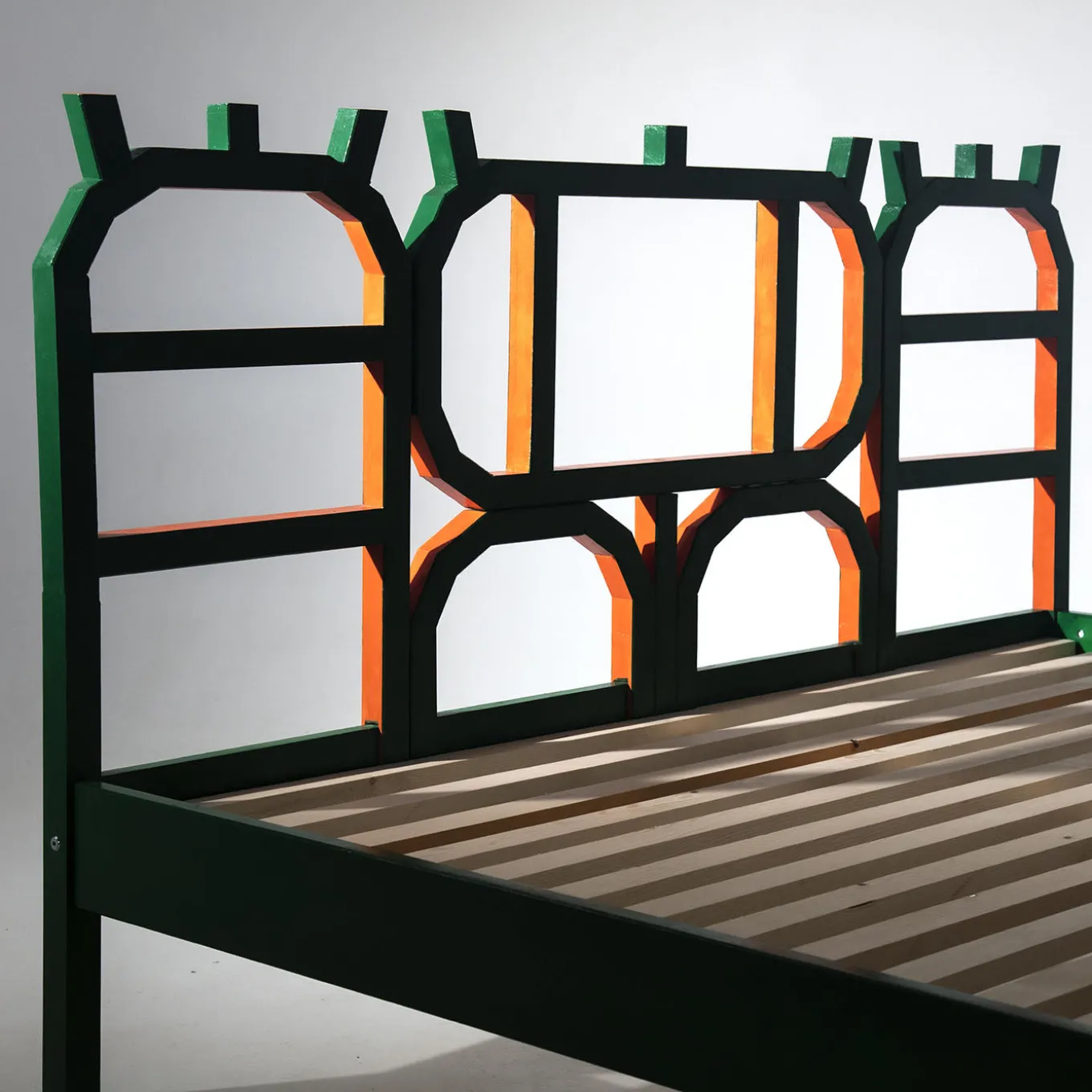 Il letto Guarino presenta una caratteristica struttura in legno laccato verde con un originale design geometrico della testiera, che unisce estetica moderna e artigianato tradizionale. Questo letto matrimoniale offre opzioni personalizzabili, comprese misure e finiture uniche, ed è realizzato su ordinazione in un laboratorio specializzato a Roma, per garantire sostenibilità e precisione nella produzione. Contattare il Concierge per maggiori dettagli.