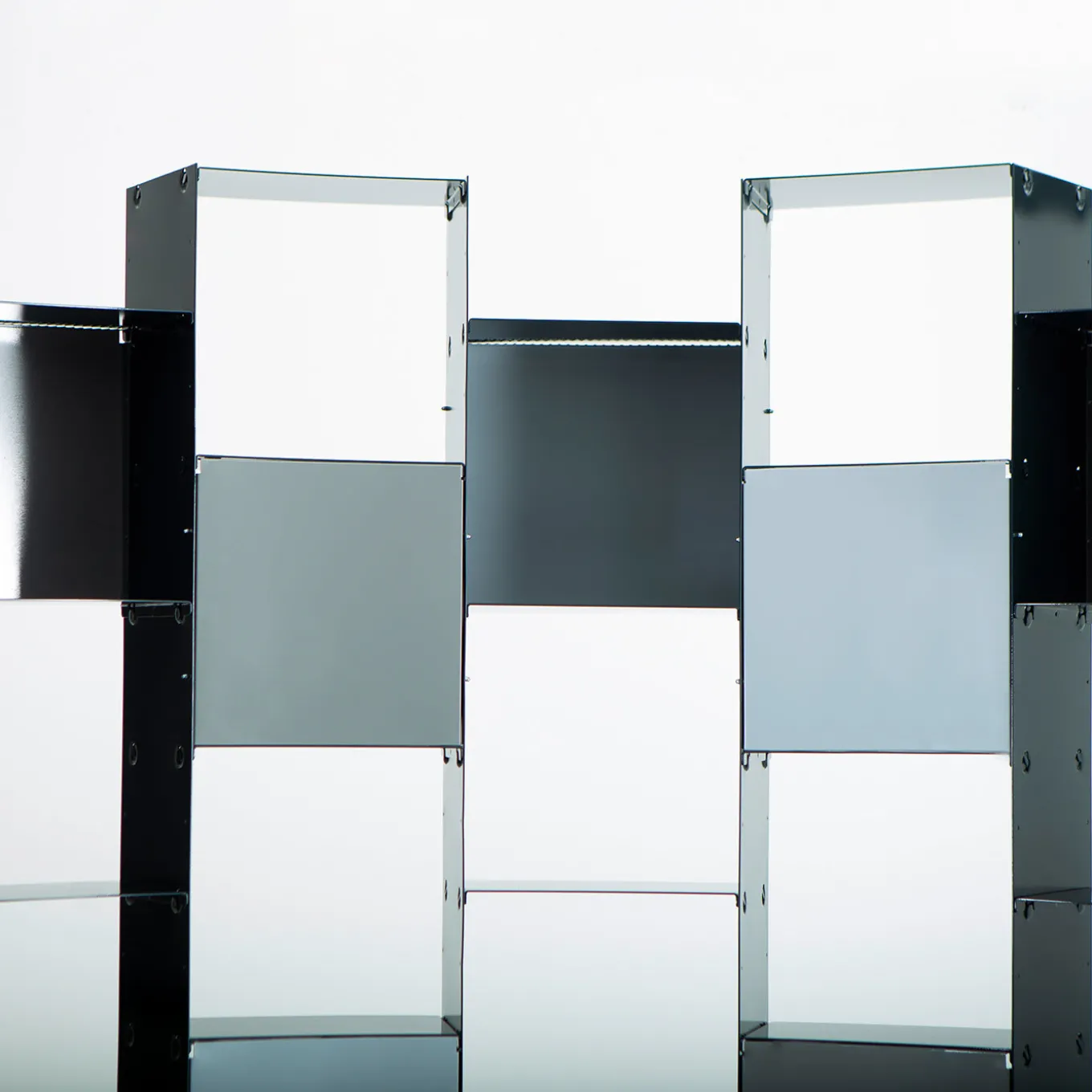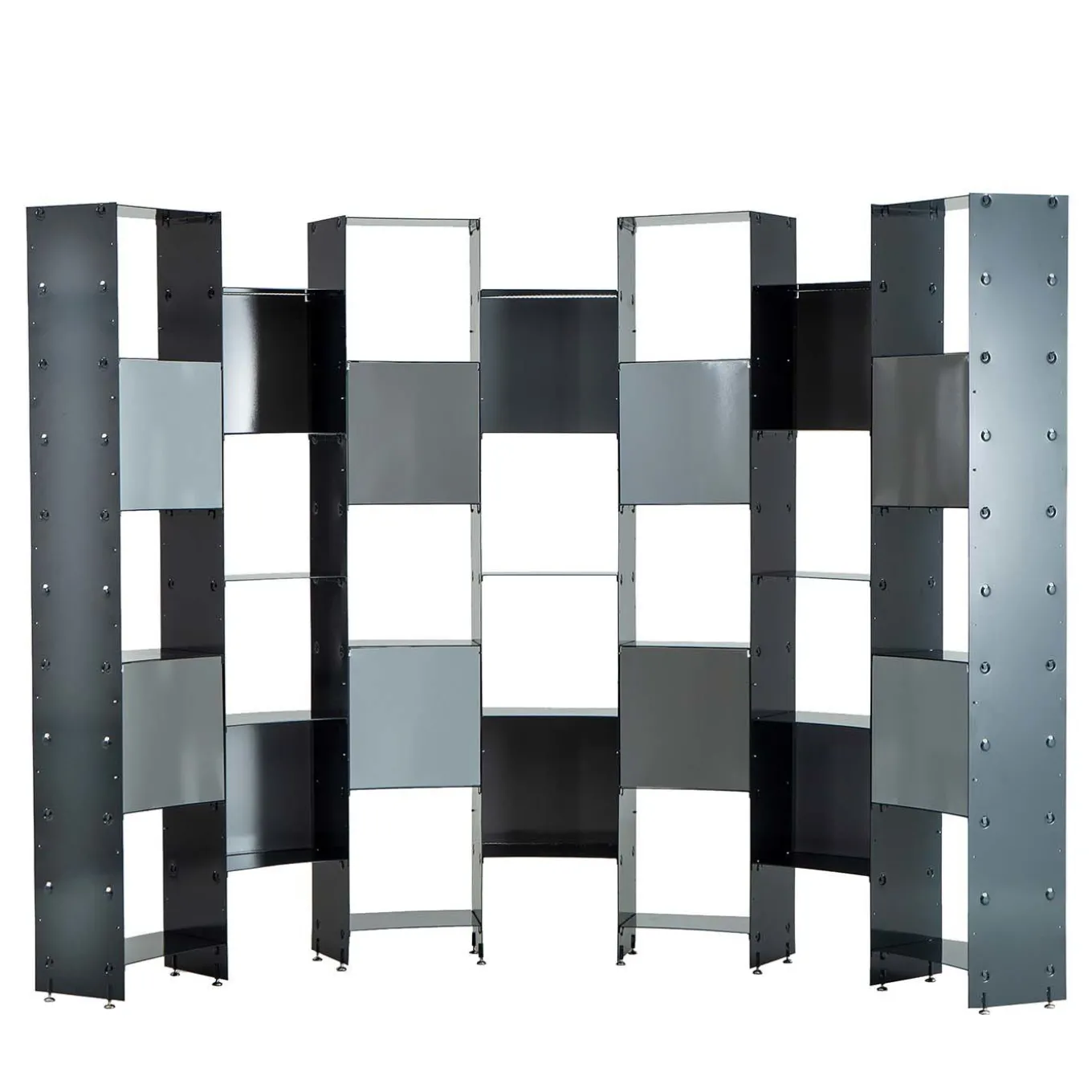 Audace e assolutamente originale, questa superba libreria sarà il punto focale architettonico di qualsiasi arredamento, in grado di ancorare l’equilibrio estetico e spaziale di decori moderni e di ispirazione industriale. Interamente realizzata in lamiera d’acciaio rettangolare, è composta da quattro unità, ciascuna con due quadrati chiusi, collegate da due cornici aperte e da un ripiano di forma semicircolare. La struttura risultante è imponente e visivamente affascinante e può essere utilizzata sia come libreria a parete che come divisorio funzionale in un loft o in uno spazio commerciale.