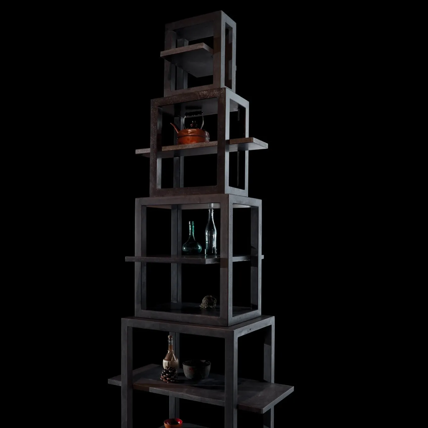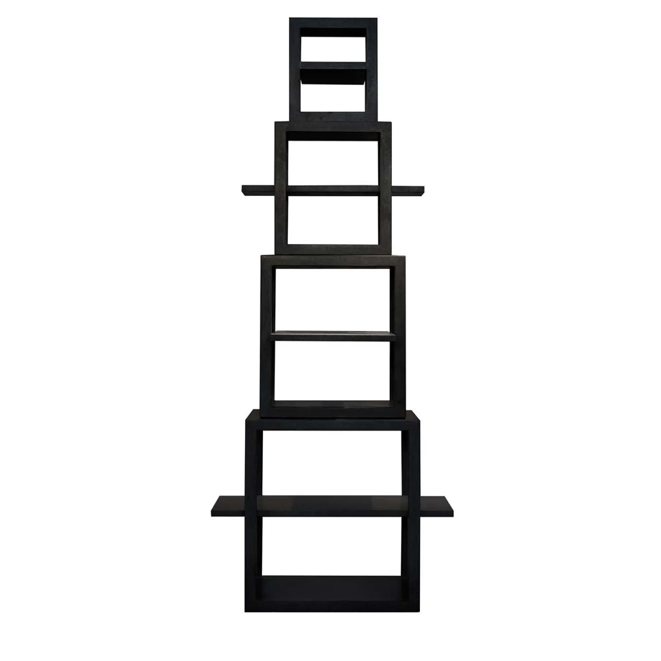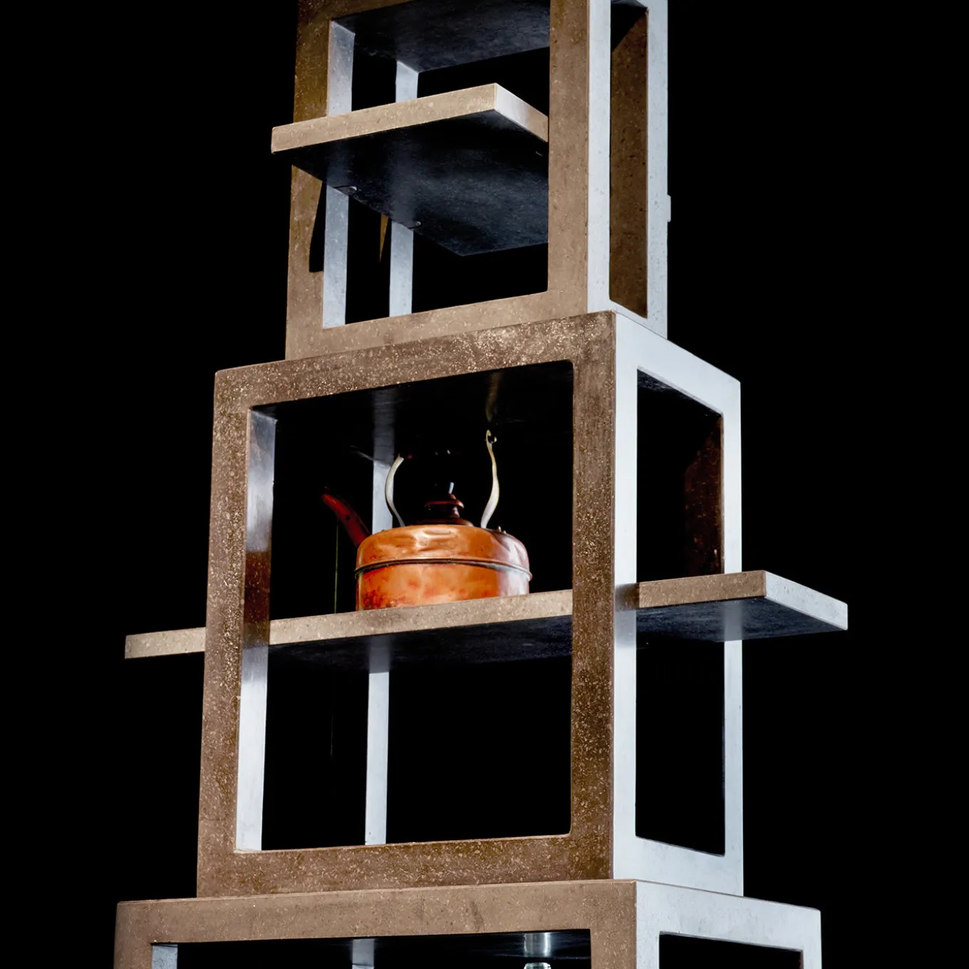 Questa libreria contemporanea è interamente in pietra lavica, realizzata impilando uno sull’altro quattro ripiani cubici cavi sempre più piccoli e concentrici. I trampolini sporgono su assi orizzontali, fornendo una preziosa superficie espositiva. Le lastre di pietra lavica hanno uno spessore di 5 e 3 cm con finitura levigata. Il peso totale dell’opera è di 450 kg.