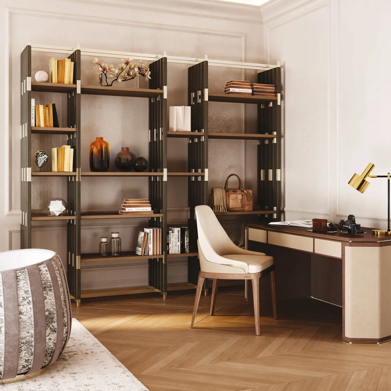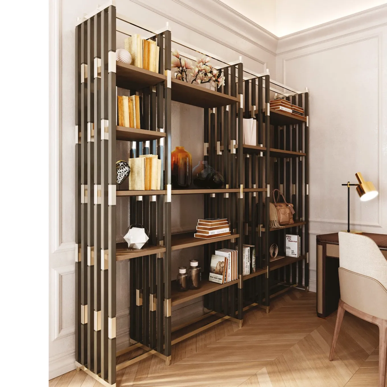 Con un tocco architettonico minimalista, questa libreria modulare sarà un accento distintivo e sofisticato per gli interni contemporanei. È caratterizzata da una struttura in rovere wengé con dettagli in metallo impreziositi da una finitura champagne. I ripiani possono essere posizionati secondo le preferenze personali e, a scelta, si possono richiedere più moduli. Per ulteriori informazioni, rivolgersi al Concierge.