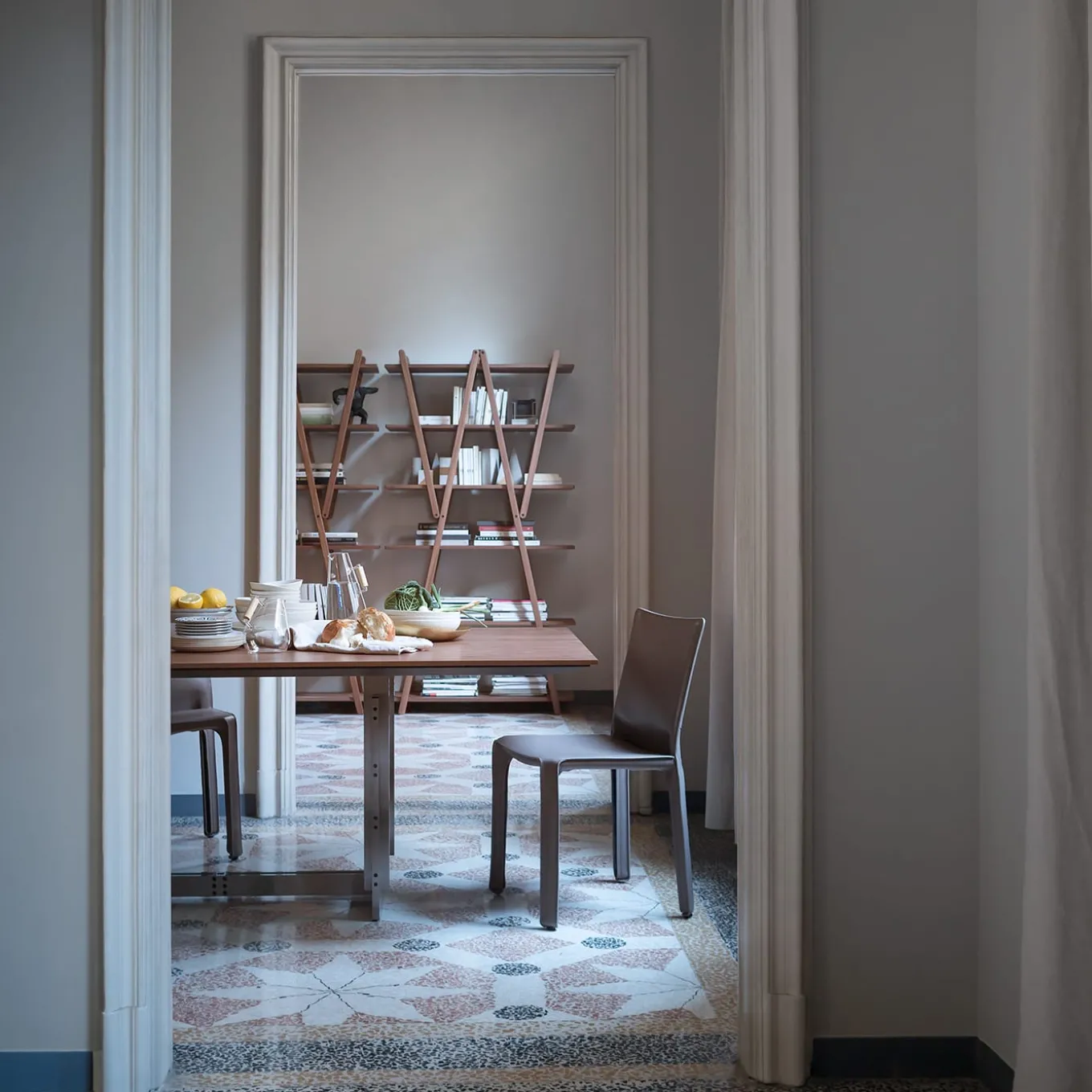 Disegnata da Vico Magistretti, questa libreria dalle linee semplici e pulite nasce da un’analisi dettagliata del modello classico con supporti laterali e ripiani. I puntoni diagonali diventano la struttura portante e ospitano i ripiani, eliminando la necessità di supporti laterali. Ponendo l’accento sulle cerniere e sui sei ripiani, la struttura, che può essere ripiegata, può essere utilizzata anche come divisorio.