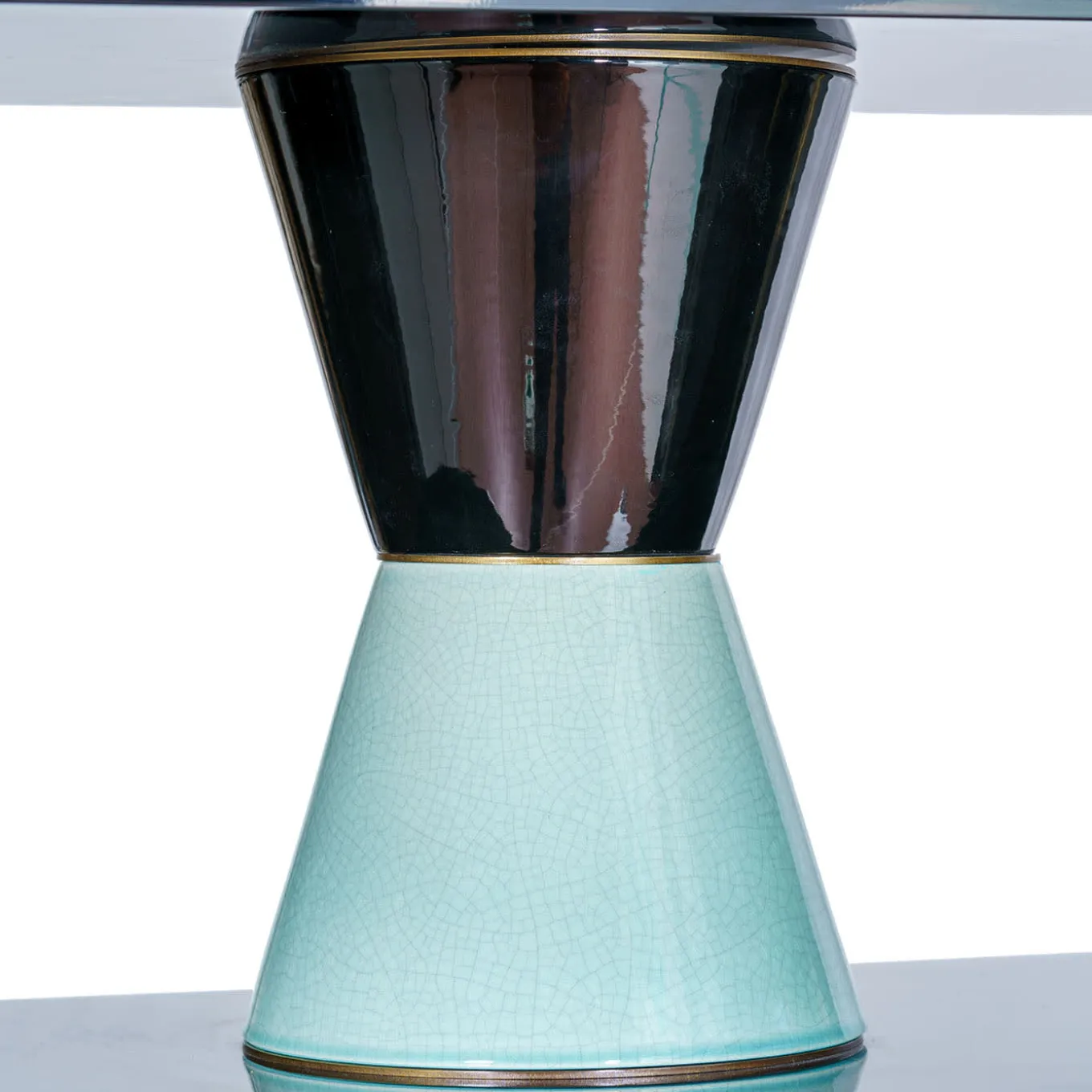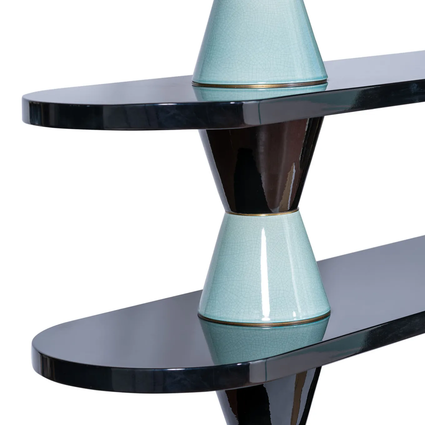 La struttura di questa libreria disegnata da Piero Angelo Orecchioni è stata presentata al Salone del Mobile di Milano nel 2019. Il profilo di grande impatto è costituito da tre aste in ottone spazzolato che racchiudono il pezzo su un’estremità, mentre i coni di ceramica svasati blu e neri alternati sull’altra estremità aggiungono un accento colorato. Questa cornice di grande effetto sostiene cinque ripiani in legno laccato nero per un’esposizione versatile che è un’ottima decorazione in una casa moderna. Tutti gli elementi possono essere modificati e personalizzati; chiedete al Concierge per i dettagli.