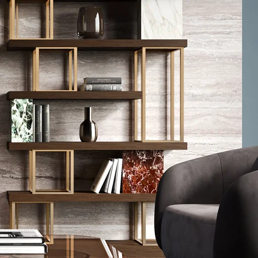 Vero e proprio capolavoro di interior design, questa libreria sfoggia un fascino singolare e scultoreo che si inserisce in modo audace e iconico in qualsiasi ambiente classico o contemporaneo. Sapientemente realizzata a mano, presenta ripiani in noce canaletto e una struttura in metallo satinato oro champagne completata da tre inserti in marmo, Rosso Lepanto, Calacatta oro e Verde Alpi. Personalizzabile su richiesta, chiedere al Concierge per dettagli e opzioni.