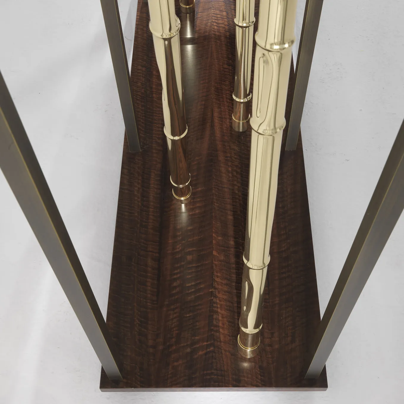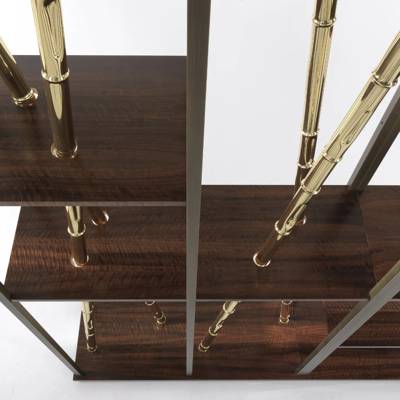 La canna di bambù, elemento evocativo di ispirazione naturalistica, viene proposta con una finitura in ottone lucido, un richiamo all’etnico che incontra la raffinatezza di materiali preziosi, dando vita a un’insolita combinazione di elementi. L’elemento è inserito all’interno di una struttura scultorea che alterna legno di eucalipto affumicato e ottone con finitura bronzata, dando vita a una libreria imponente e raffinata, dall’aspetto scultoreo e scenografico. Struttura della libreria in metallo bronzo patinato. Canne di bambù in ottone lucido. Base e ripiani in legno di eucalipto frisè affumicato. Chiedere al Concierge le varianti disponibili.