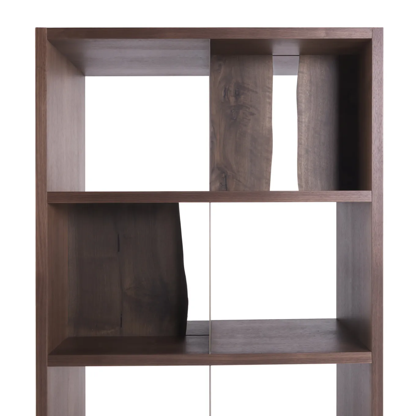 Magnifico pezzo moderno di sapiente artigianato tradizionale, questa suggestiva libreria è interamente realizzata in legno di noce canaletto, che mette in evidenza la sua naturale tonalità scura. Il pezzo è composto da quattro ripiani, ciascuno con due scomparti divisi da pannelli in metallo e resina arricchiti da dettagli in ottone spazzolato. Questa libreria sarà un pezzo forte per un arredamento moderno.