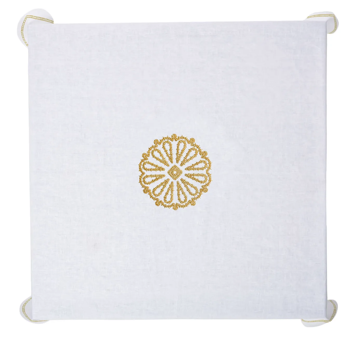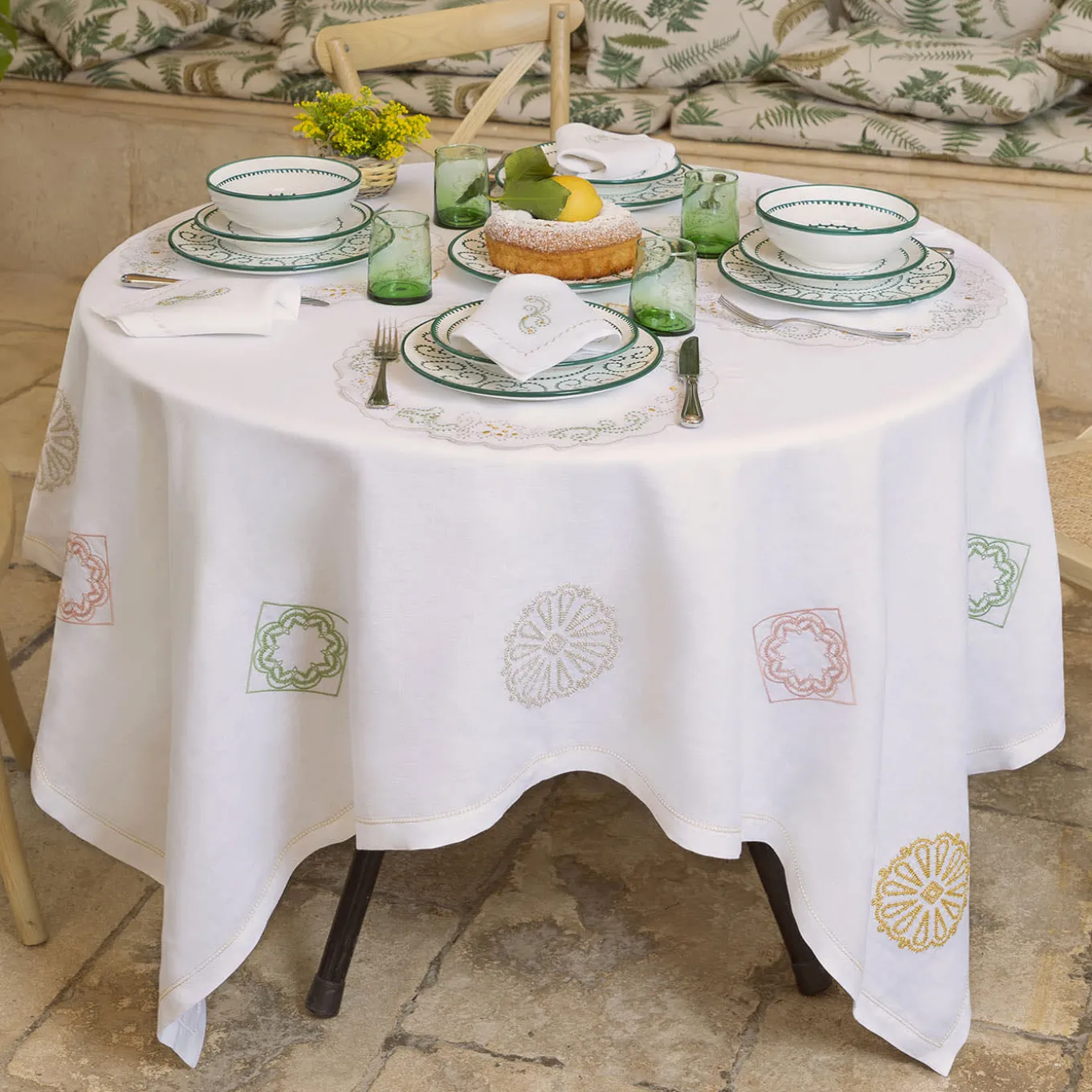 Intriganti nelle loro forme floreali e nella loro vibrante luminosità, le colorate installazioni luminose tipiche delle feste di paese pugliesi hanno ispirato i minuziosi ricami manuali in cotone Mako che ornano questa preziosa tovaglia di lino. Una vetrina della maestria del ricamo, ogni pezzo è un gioiello artigianale senza tempo che distilla una raffinatezza senza sforzo. Nel catalogo Artemest sono disponibili diverse opzioni di dimensioni e varianti di colore.