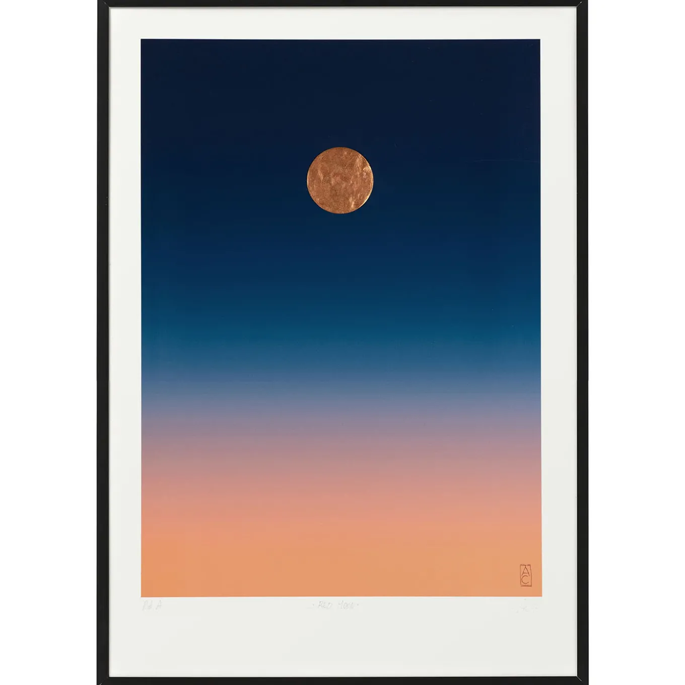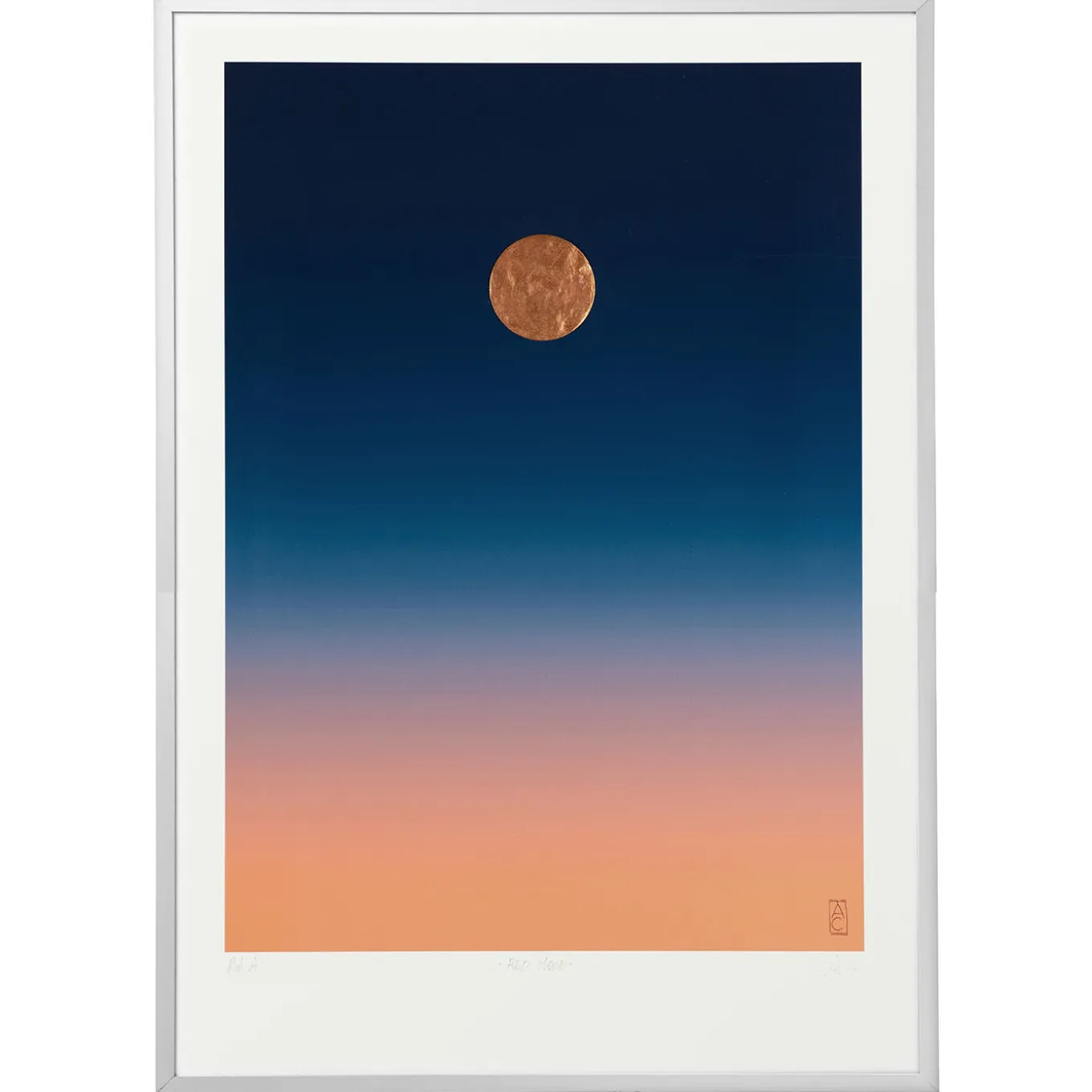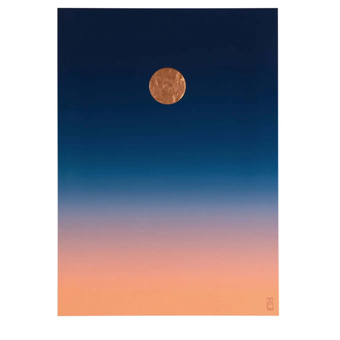 Questa romantica stampa tipo glicée su cotone 100% si ispira al celebre verso “Che fai tu, luna, in ciel? dimmi, che fai, silenziosa luna?” che il poeta Giacomo Leopardi dedicò alla luna. La luna piena – realizzata con un piatto d’argento – si staglia su uno sfondo onirico in cui il blu profondo sfuma progressivamente in arancione albicocca, evocando un tramonto. Si prega di chiedere al Concierge il prezzo della cornice (non inclusa) e della variante di 50×70 cm.