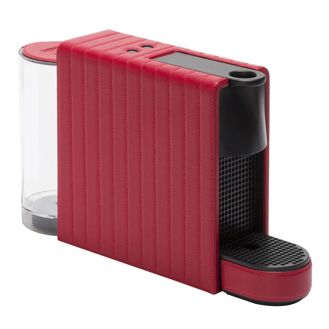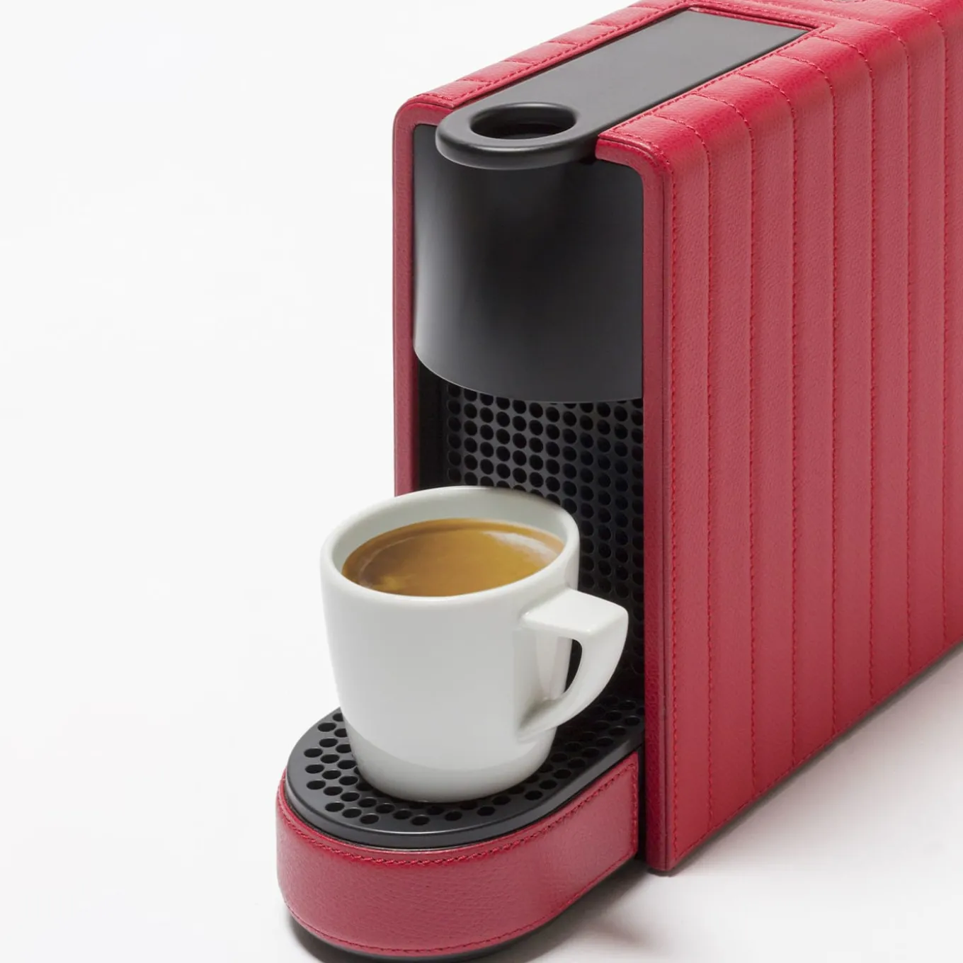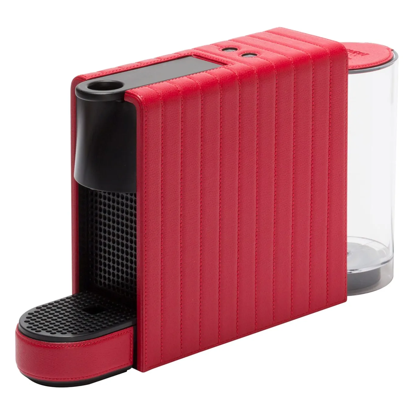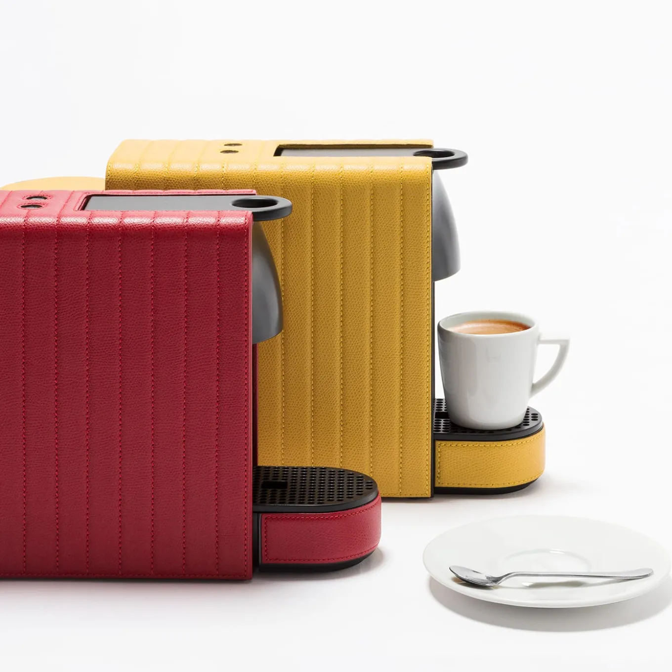 Originale macchina Nespresso rilegata in pelle con un motivo di trapunta a righe. Utilizza le classiche capsule Nespresso. Tensione disponibile: 110V (prezzo disponibile su richiesta) o 220V.