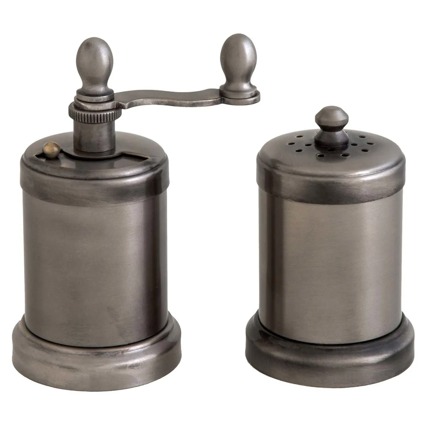 Stile del vecchio mondo con possibilità del nuovo mondo, questa saliera e macinapepe in ottone argentato è caratterizzata da una finitura invecchiata. Il macinapepe può essere utilizzato con granuli di sale nero, verde o bianco fino a 5 mm, mentre il sale rosa può essere utilizzato in miscela fino al 15%.