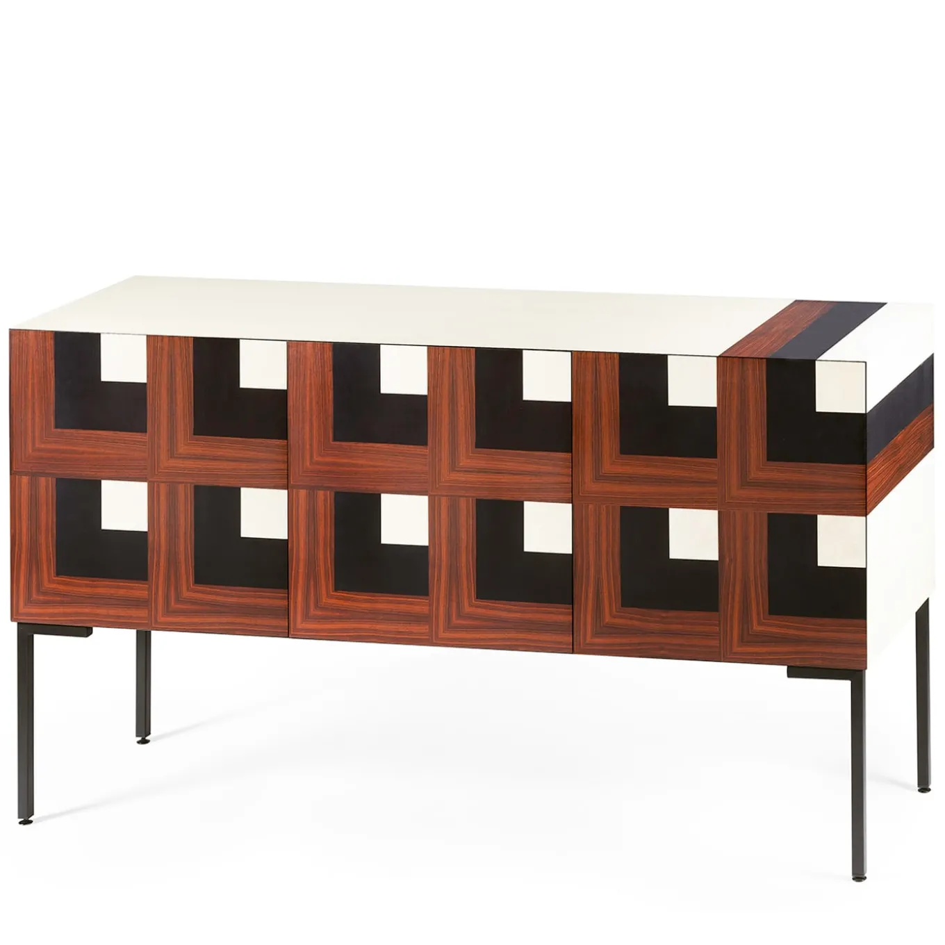 Esperti maestri del legno hanno realizzato questo pezzo che presenta una squisita decorazione in legno che ricrea un’illusione ottica tridimensionale. I legni utilizzati sono l’ebano, il bois viola e il frassino sbiancato, mentre l’interno del pezzo è in prezioso palissandro Santos. Le gambe allungate in ferro spazzolato con finitura nera opaca completano questo oggetto di grande effetto che conferisce un fascino senza tempo a qualsiasi spazio.