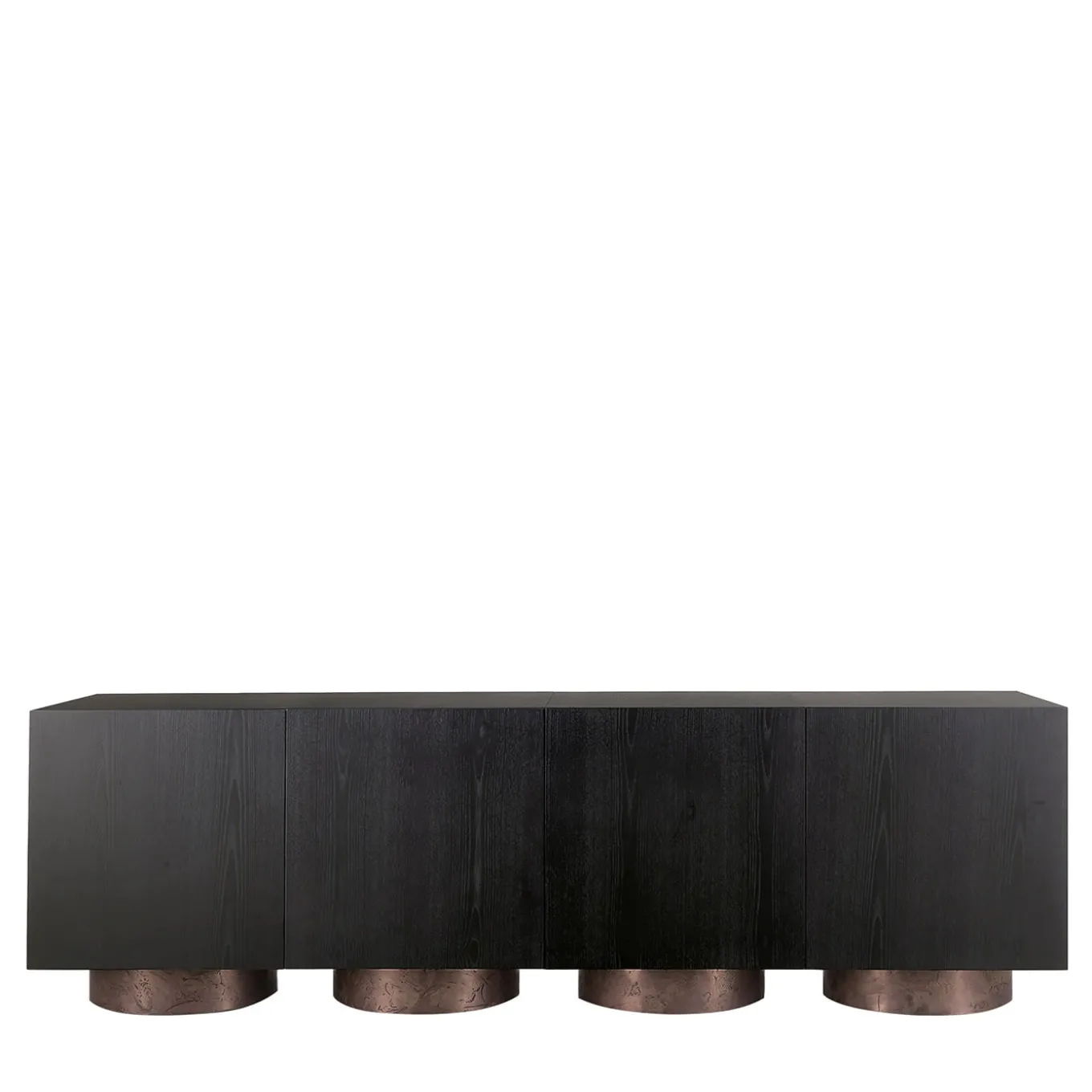 Ispirati al più famoso dei cubi, questi volumi possono essere impilati all’infinito. Il suo aspetto rigido ed essenziale è inversamente proporzionale alla sua flessibilità compositiva. Ante con sistema di apertura push-pull. Vano interno con ripiano in vetro bronzo. L’elemento è componibile come credenza o libreria. Impiallacciatura in legno di frassino in finitura nera opaca a poro aperto, base in mdf con finitura in metallo Pure in mix rame brunito-bronzo. Sono disponibili altre finiture, per maggiori informazioni contattare la portineria.