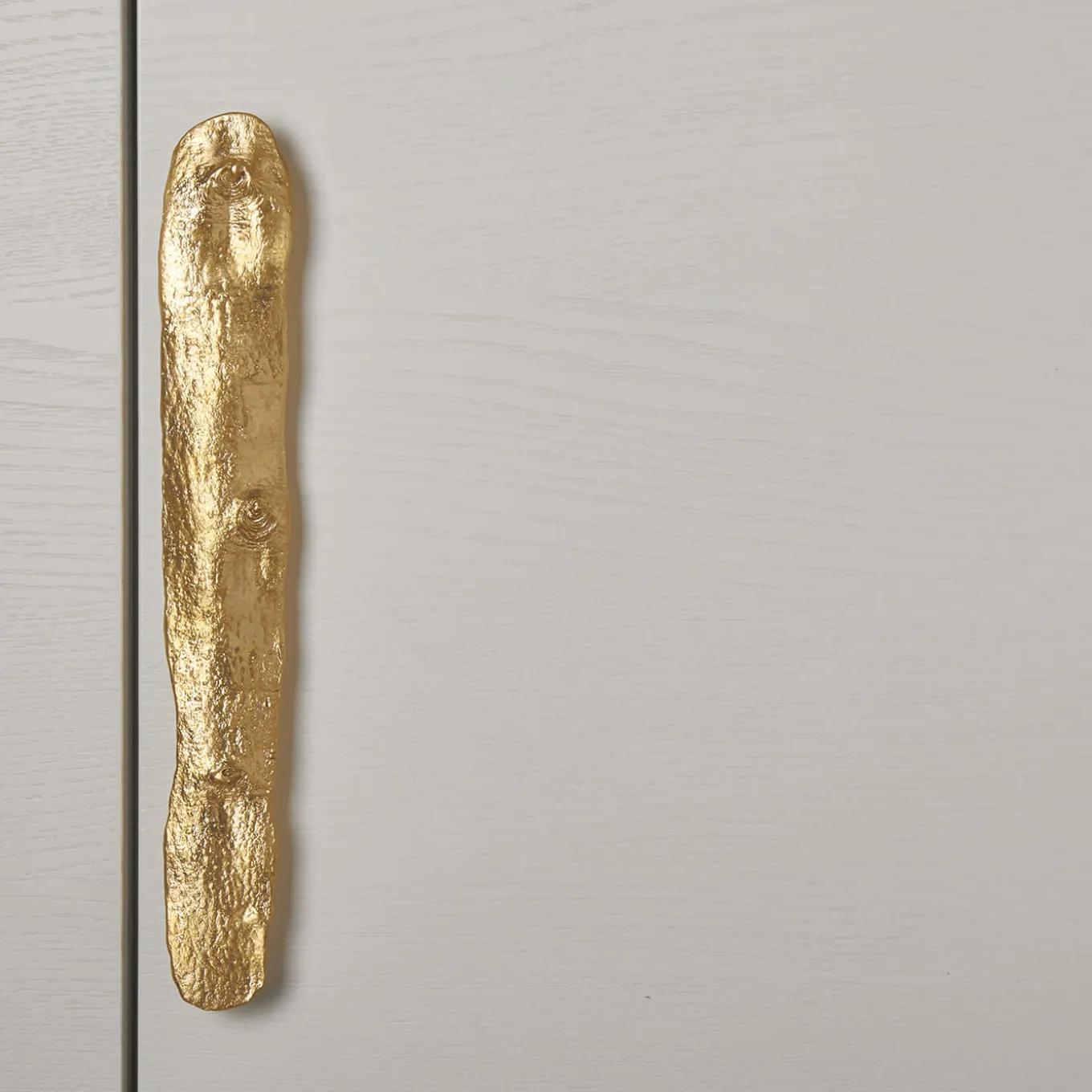 Una splendida opera d’arte diventa un funzionale elemento d’arredo nella collezione di maniglie Foresta Nera disegnata da Nicole Valenti. Questa maniglia, che fa parte della serie Olmo ispirata all’olmo, è caratterizzata da una forma singolare sapientemente lavorata a mano in ottone naturale e infine lucidata per ottenere la caratteristica lucentezza.