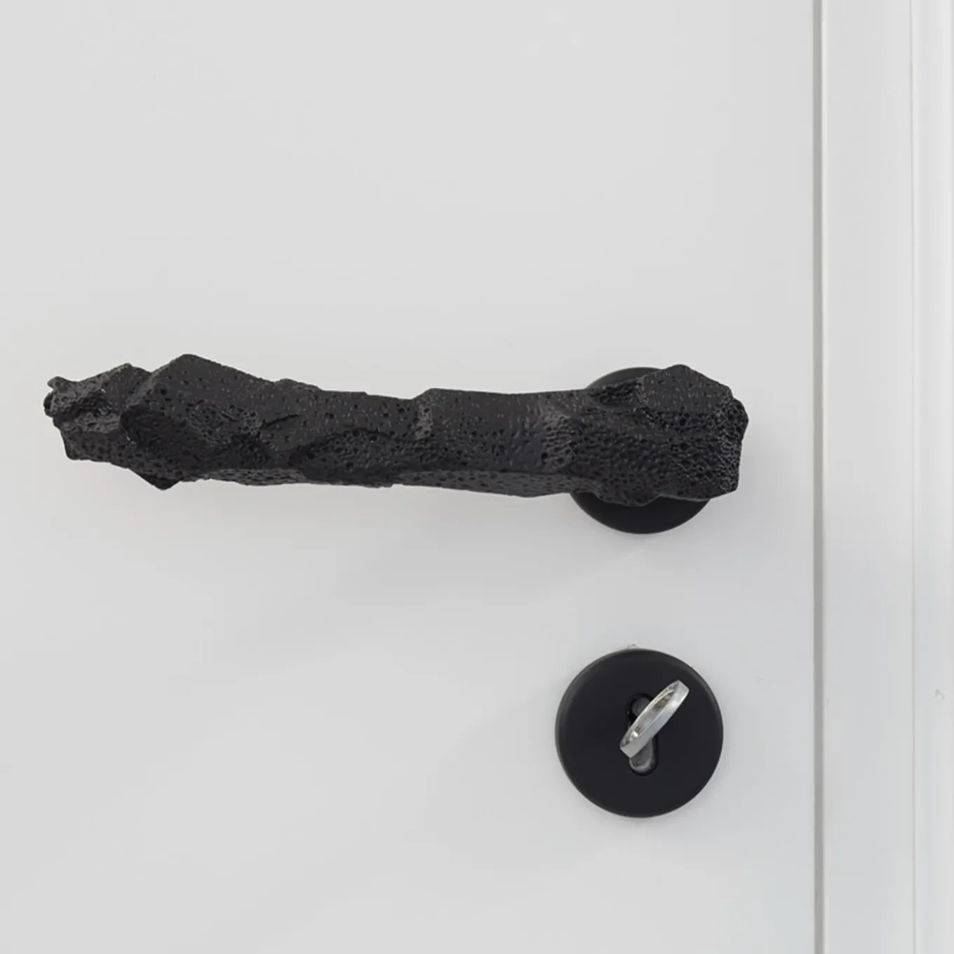 Parte della serie di maniglie per porte Lavica, che riproduce minuziosamente il fascino della pietra lavica, questa preziosa maniglia è abilmente realizzata a mano in alluminio con finitura nera e una superficie strutturata e porosa di grande impatto visivo. Disegnata da Nicole Valenti, aggiungerà un accento singolare a qualsiasi arredamento.