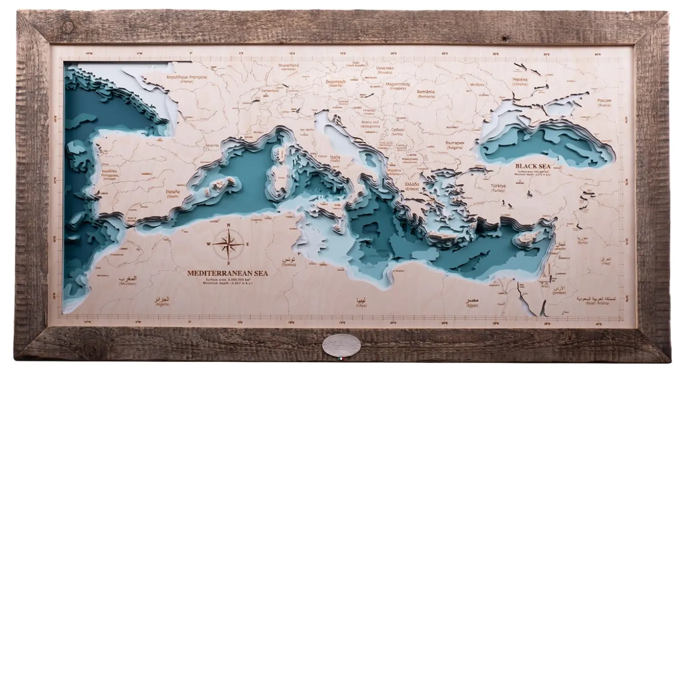 Rappresentazione tridimensionale del Mar Mediterraneo, questo splendido disegno sarà un’aggiunta elegante e sofisticata a un arredamento in stile contemporaneo. Racchiuso in una cornice di legno, presenta splendidi dettagli artigianali. Per ulteriori informazioni sui materiali e sulle tecniche di lavorazione, consultare il Concierge.