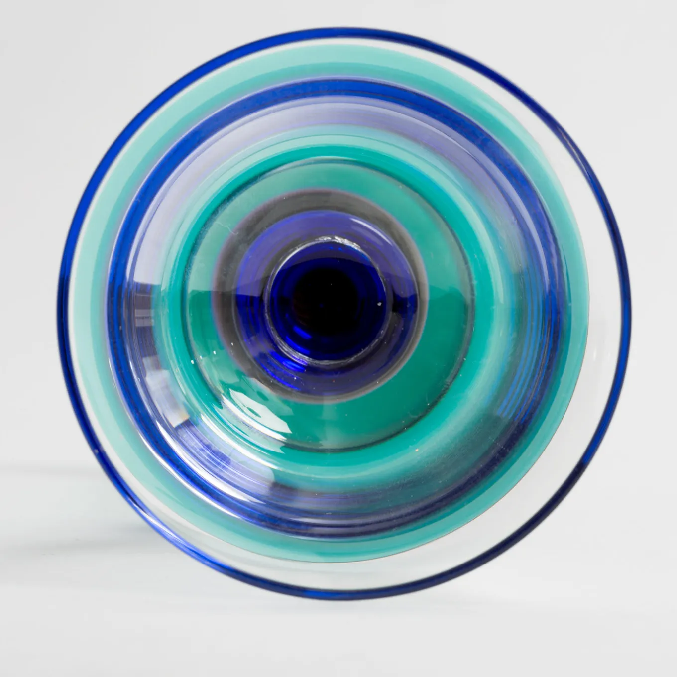 Questo raffinato set di tre bicchieri per due persone è composto da due bicchieri da vino (Ø 7 cm, H 20,5 cm), due bicchieri da acqua (Ø 8,5 cm, H 23 cm) e due flutes (Ø 6,5 cm, H 25 cm), e presenta linee eleganti e colori vivaci. Ogni bicchiere ha una base verde che diventa blu nella parte superiore. Il corpo dei bicchieri è di colore cristallo.