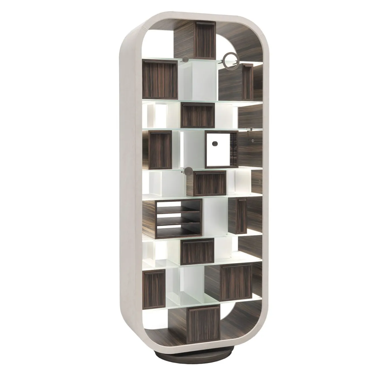 Disegnato da Stefano Boeri Architetti, questo mobile contenitore girevole “Mettitutto” (che significa “prendi tutto”) è un pezzo eccezionale realizzato con un arredamento moderno ed elegante. Le scaffalature aperte e il sistema di cassetti modulari sono accessibili da entrambi i lati, accentuando il contrasto tra gli accenti geometrici dell’interno in noce e vetro e la struttura arrotondata dell’esterno rivestita in pelle bianca. Accessori, sistema di illuminazione a LED e porte USB sono inclusi nell’acquisto.