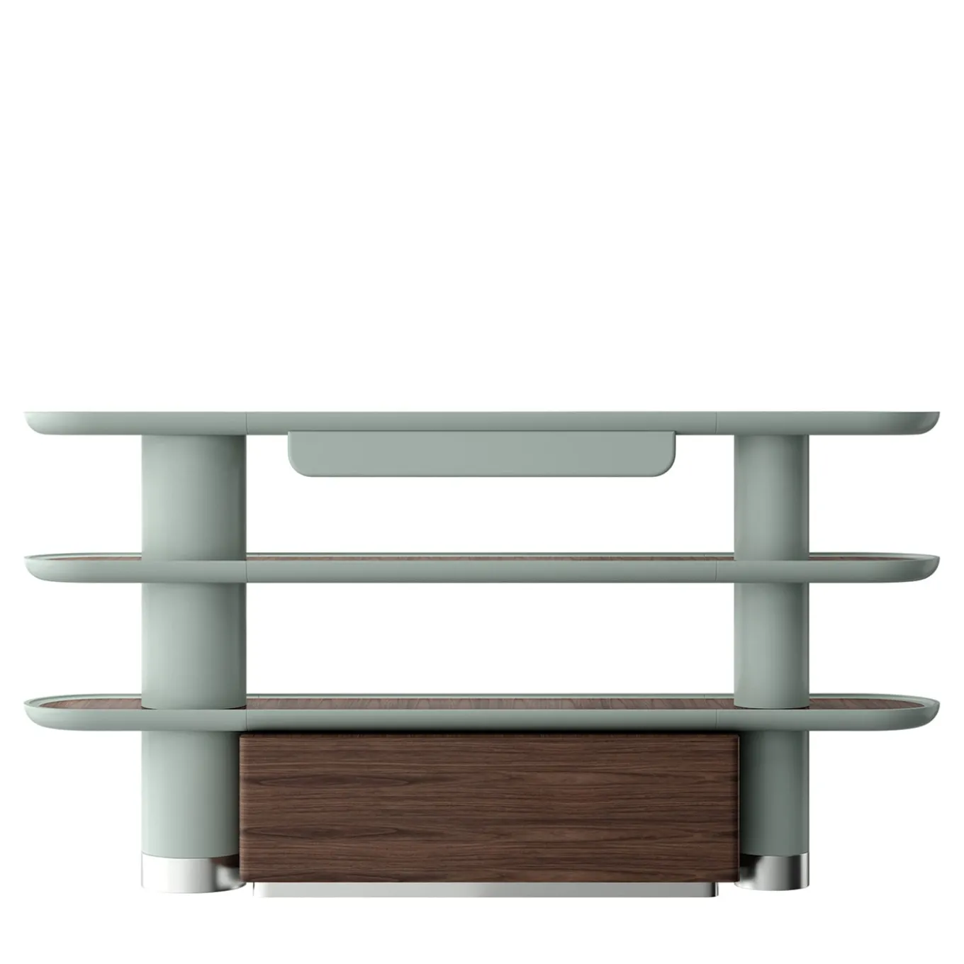 Esigenze contenitive ed estetiche sono superbamente sintetizzate in questa sofisticata libreria, un progetto in legno proposto in una delicata tonalità azzurro pastello. Le estremità curve conferiscono ai tre ripiani un’atmosfera accogliente e la loro finitura interna in legno si abbina al pratico contenitore incorporato alla base. Un discreto cassetto in tinta si integra perfettamente con la parte superiore, massimizzando lo spazio di archiviazione senza rinunciare all’eleganza.