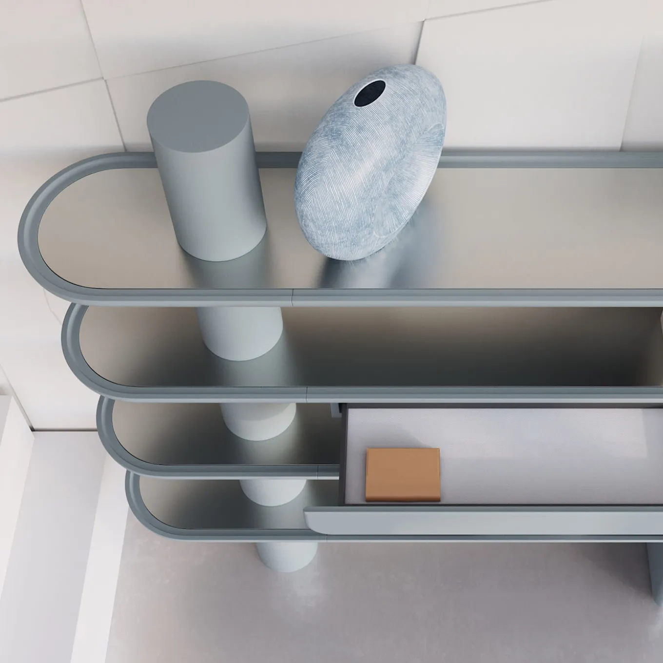 Proporzioni armoniose e curve dolci caratterizzano questa sofisticata libreria, i cui ampi quattro ripiani sono sostenuti dalla combinazione di un pannello verticale centrale e di due colonne laterali cilindriche. Proposta in una delicata tonalità di azzurro pastello, la struttura in legno offre un inaspettato spazio di archiviazione chiuso grazie ai sottili cassetti di cui è dotato uno dei ripiani. Per ulteriori soluzioni modulari, contattare il Concierge.