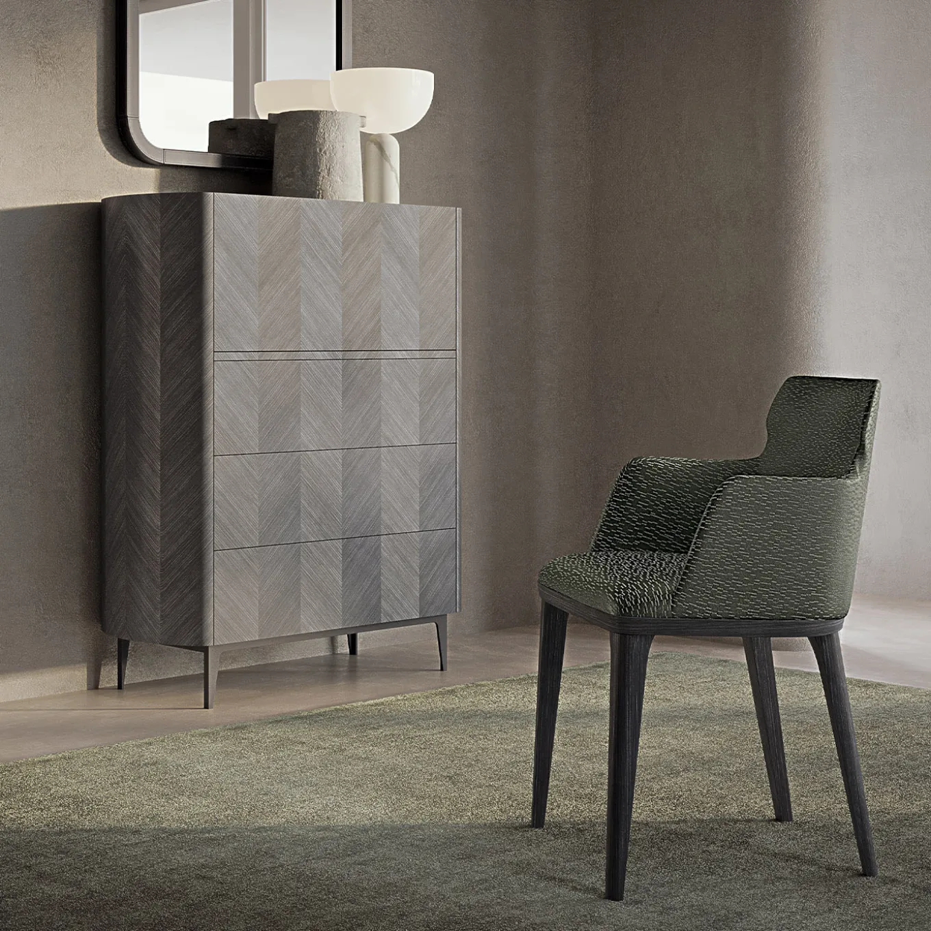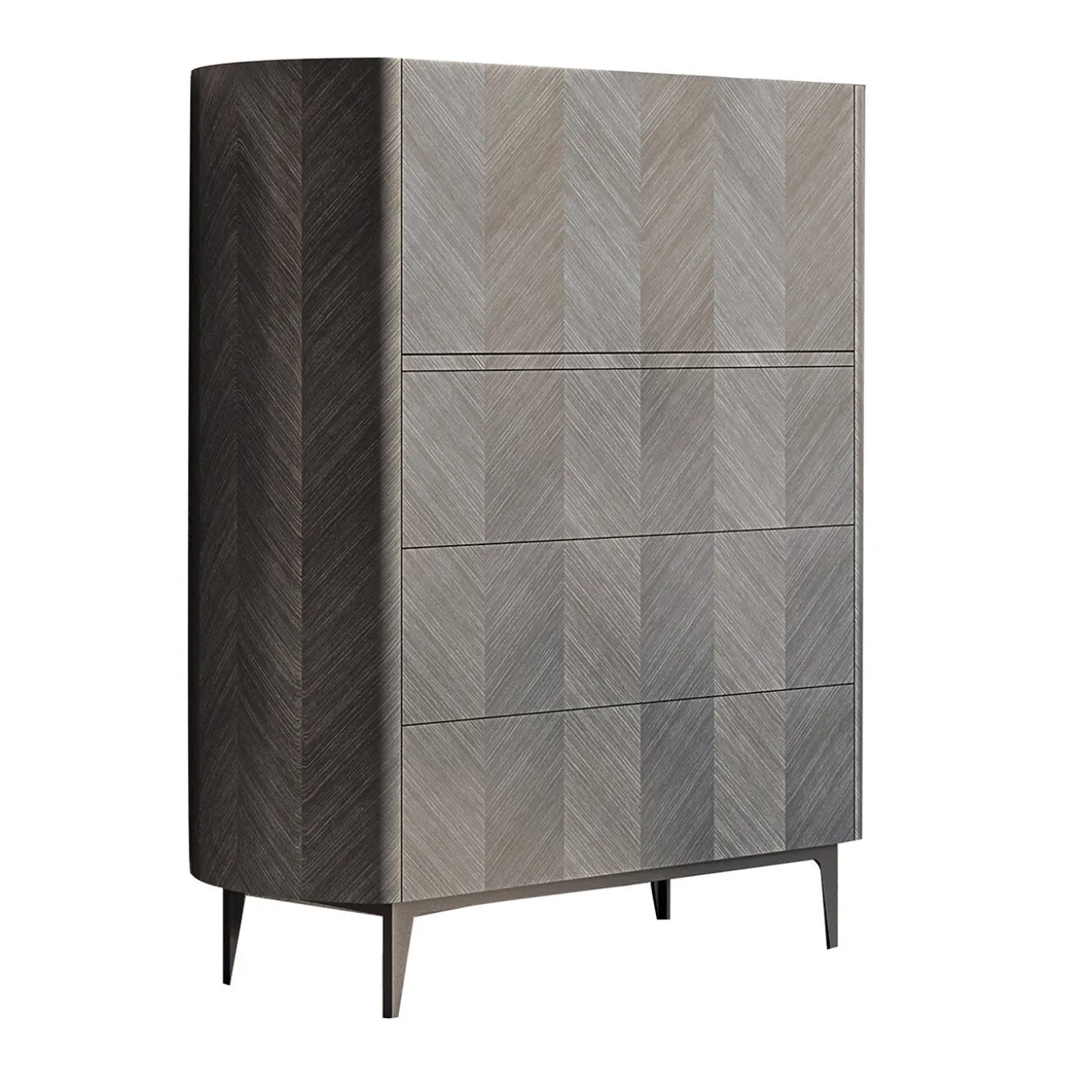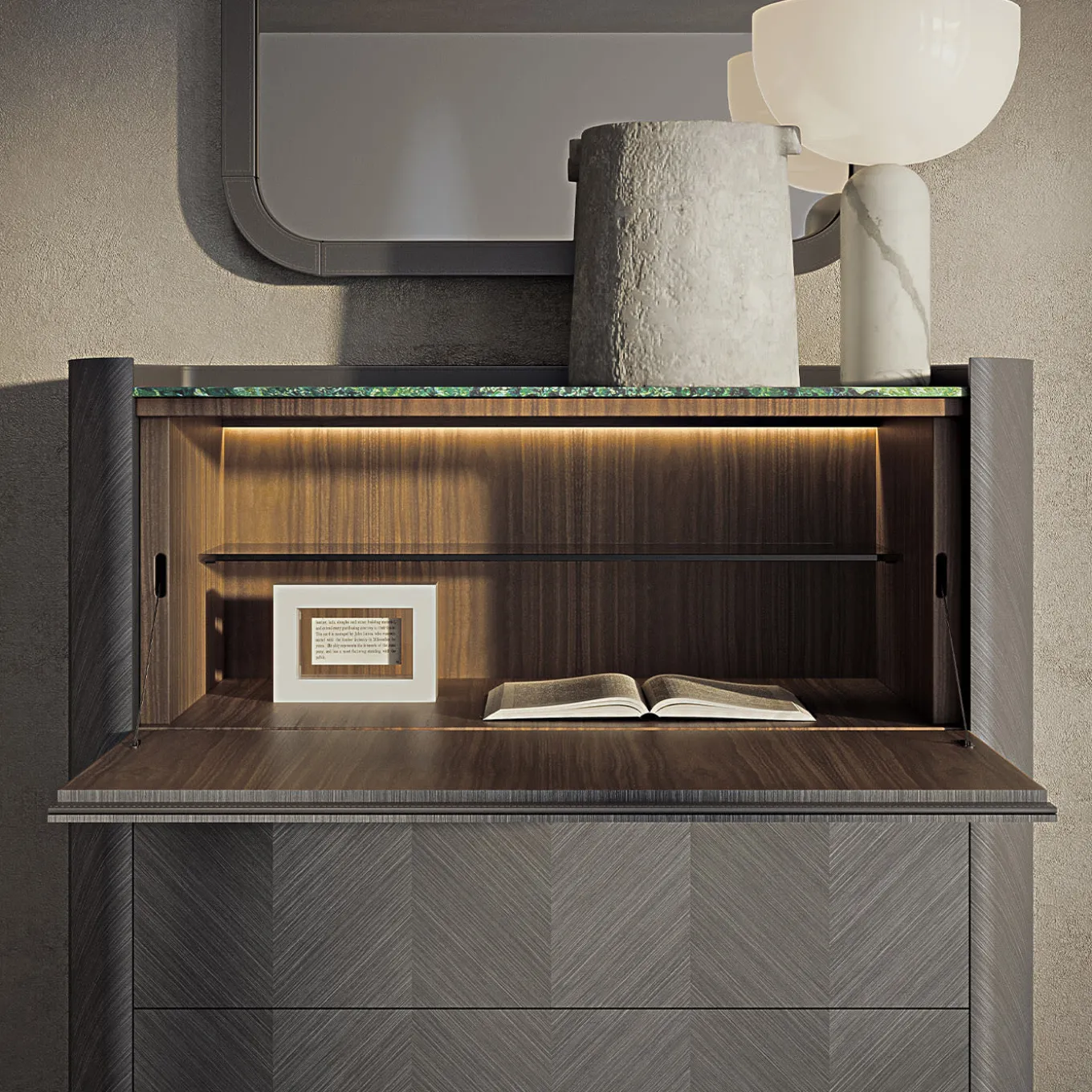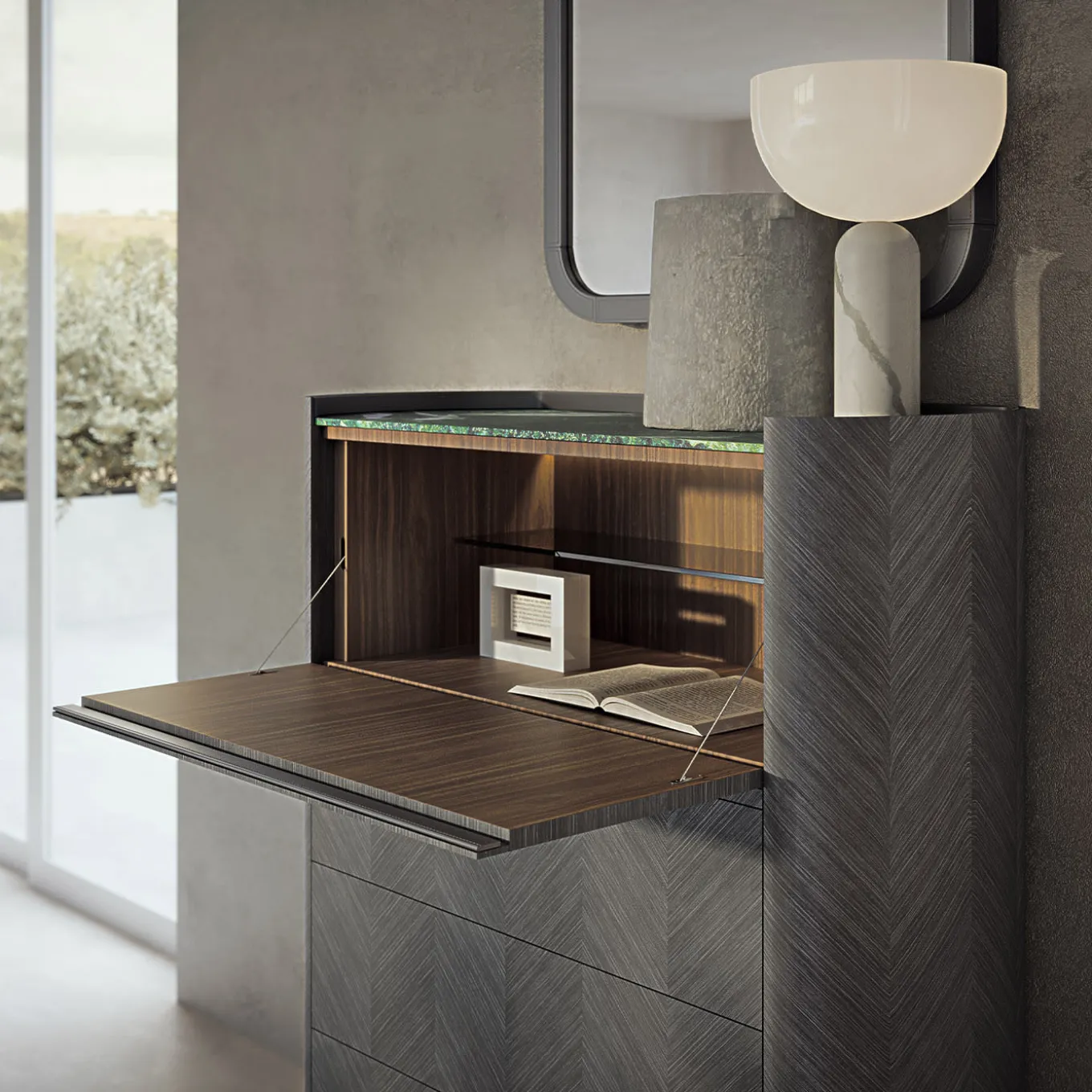 Mobile con intarsio geometrico in Tay scuro, anta a ribalta e cassetti, interno in noce canaletto, ripiani in vetro bronzato e cassetti frontali rivestiti in pelle. Piano in marmo verde Lepanto opaco e profilo in pelle. Piedini in metallo con finitura bronzo-oro, disponibili anche nelle finiture piombo e brunito. Disponibile anche con intarsio in Tay chiaro e noce canaletto. Piano in vari tipi di marmo, illuminazione interna su richiesta.