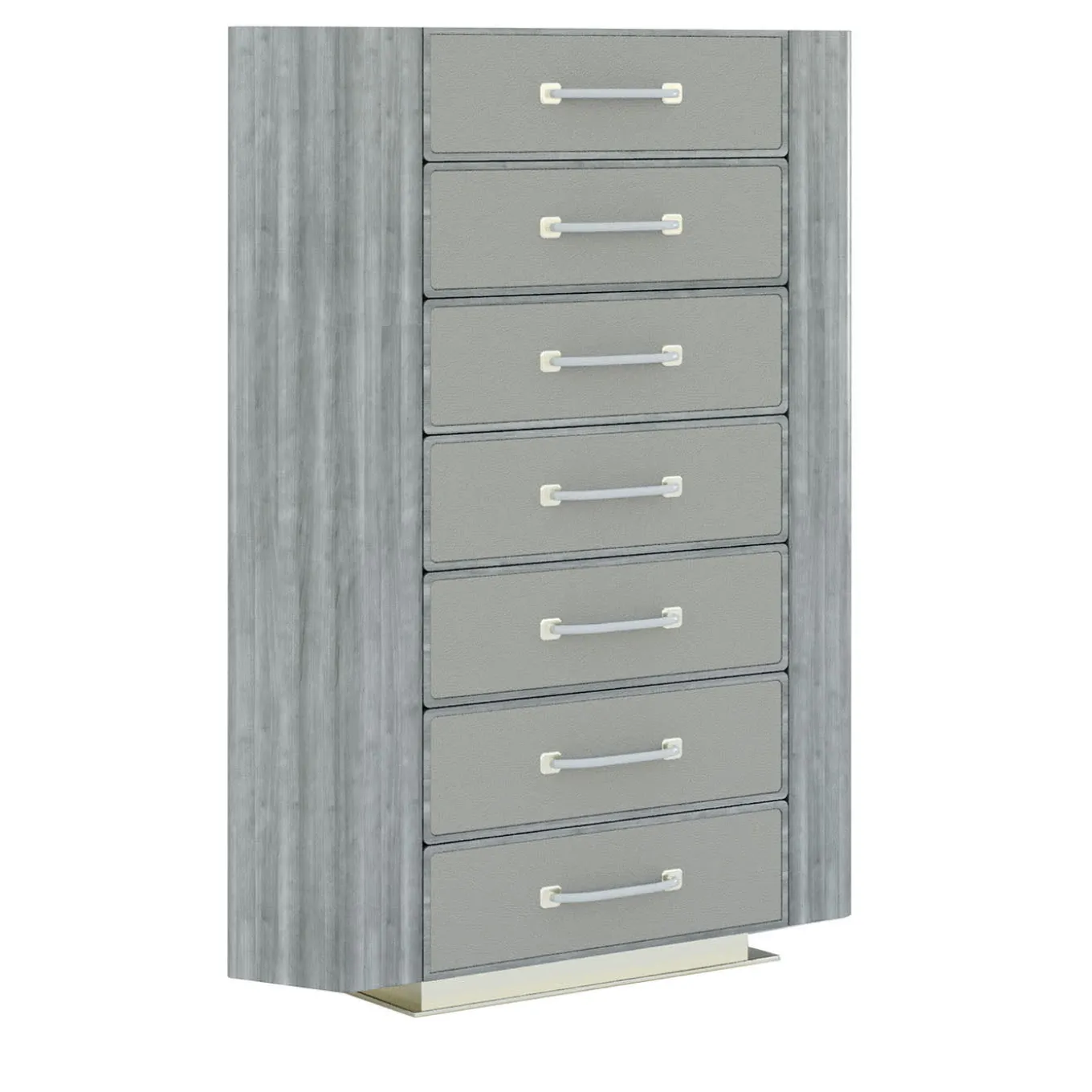 Questo mobile alto della collezione Mellifera si distingue per la meticolosa lavorazione artigianale e l’abile combinazione di materiali. La struttura in legno di eucalipto è laccata in una delicata tonalità grigia che esalta il rivestimento in pelle grigia dei frontali dei cassetti e delle maniglie. La base in metallo completa il pezzo. Per ulteriori dettagli e istruzioni per la cura, contattare il concierge.
