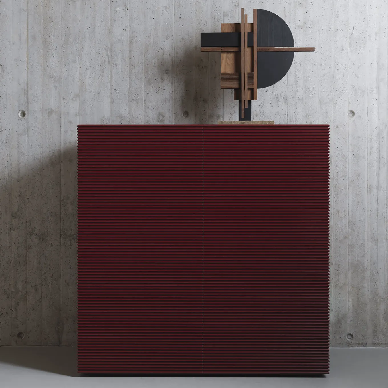 Elegante e raffinato, questo mobile bar farà bella mostra di sé in una casa moderna. Realizzato in MDF laccato rosso, presenta due ante esterne ornate da un decoro a righe fatto a mano di grande valore materico e un piano in cristallo retroverniciato. Impreziosito da uno specchio luminoso, l’interno presenta due cassetti, due ripiani estraibili, un vassoio e una luce LED (220/110) che si accende all’apertura delle ante del mobile.