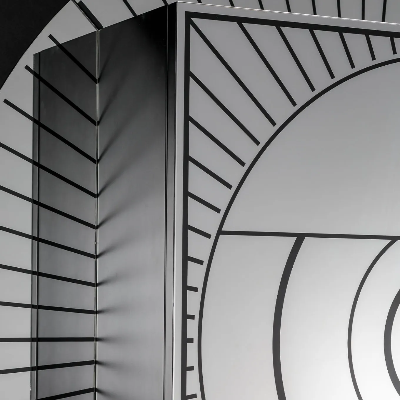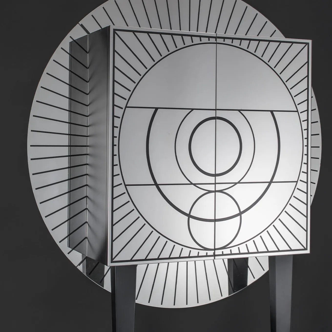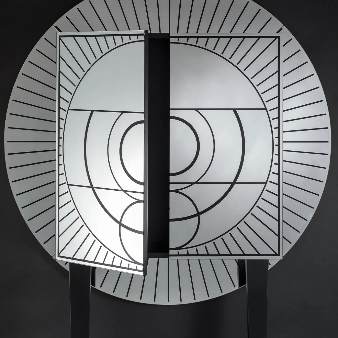Il mobile bar Aura, realizzato in collaborazione con il designer Davide G. Aquini, presenta un design straordinario che combina influenze art déco, grafiche contemporanee e motivi simbolici mistico-religiosi. È rivestito con pannelli in vetro bisellato e argentato decorati con pattern stencil. La struttura poggia su gambe in legno laccato nero e include due ripiani interni in cristallo per lo stoccaggio. Questo pezzo scultoreo fonde eleganza funzionale con espressione artistica.