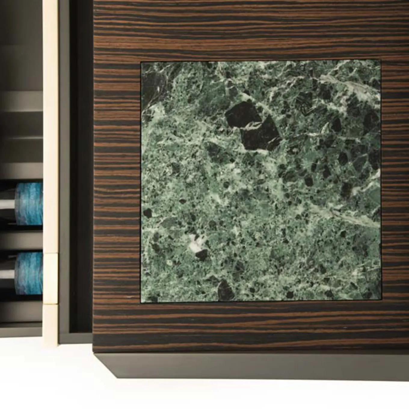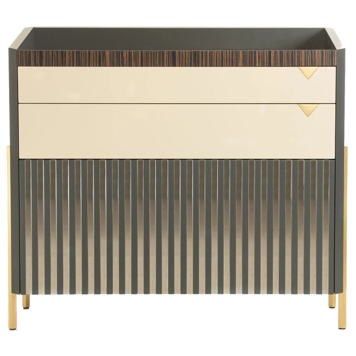 Questo mobile da bar, meraviglioso esempio di artigianato tradizionale, presenta un piano in legno d’ebano scolpito, sostenuto da una struttura in legno laccato opaco, da robuste gambe in ottone massiccio e da una superficie in marmo lucido. Impreziosito da accenti triangolari in ottone satinato e listelli a specchio, i tre cassetti offrono ampio spazio per bottiglie, bicchieri e altri oggetti essenziali per il bar. Per maggiori dettagli, consultare il Concierge.