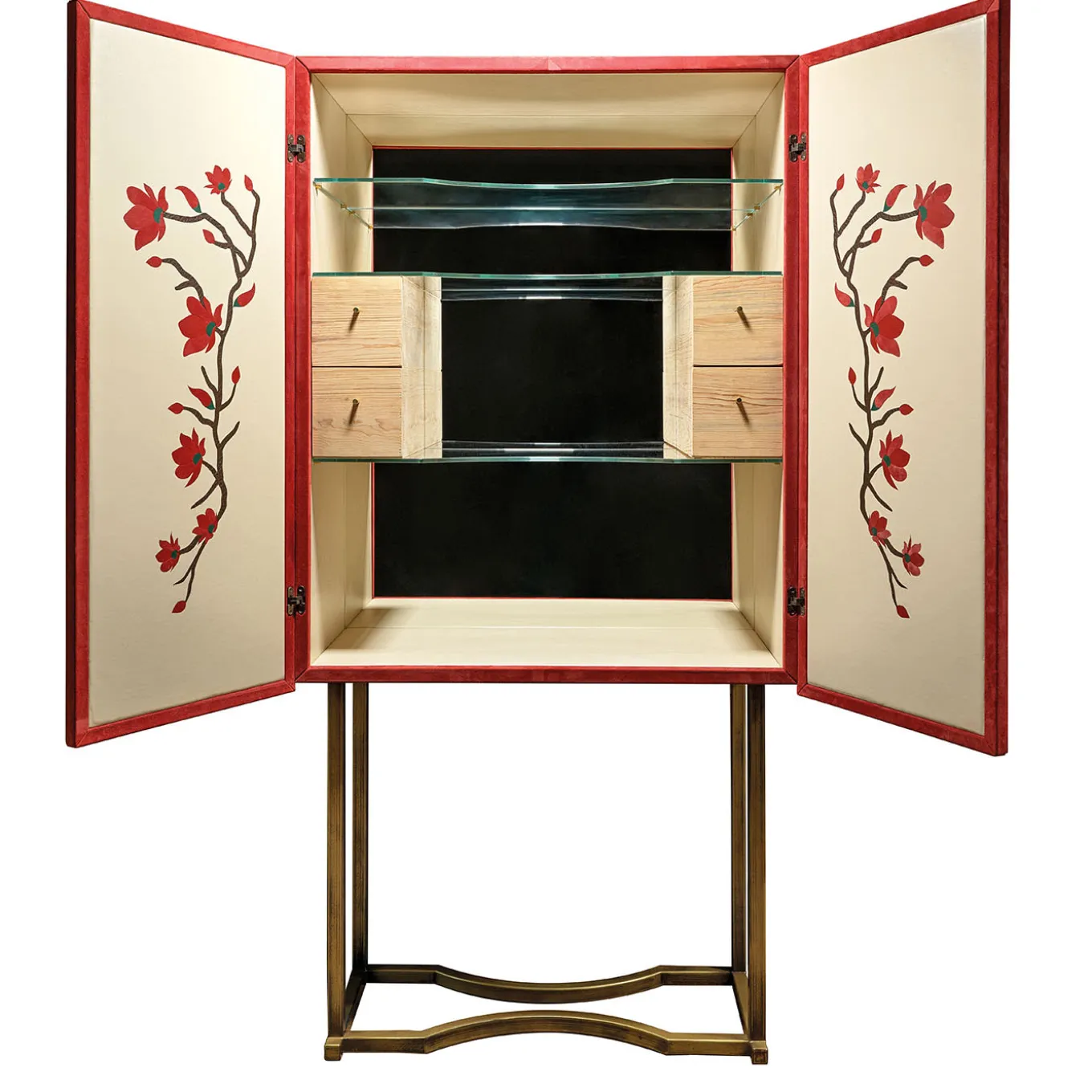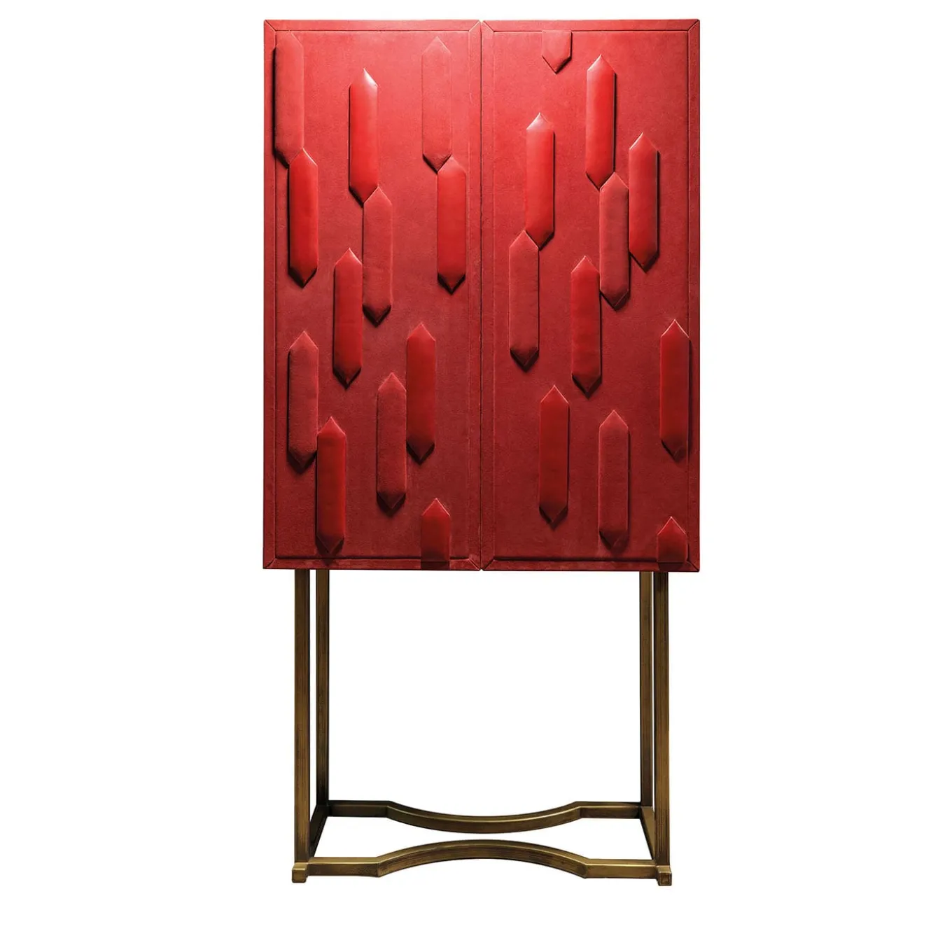 Questo elegante mobile bar è un capolavoro di artigianato contemporaneo, che unisce bellezza e funzionalità. Le sue ante sono in pelle bovina rossa, liscia e scamosciata, disposte in un motivo geometrico tridimensionale. All’interno, un delicato intarsio botanico di rami di ciliegio in diverse pelli aggiunge profondità. L’interno è dotato di tre ripiani in vetro e cassetti in legno, mentre la struttura in metallo dipinto a mano con finitura in ottone spazzolato ne esalta il lusso.
