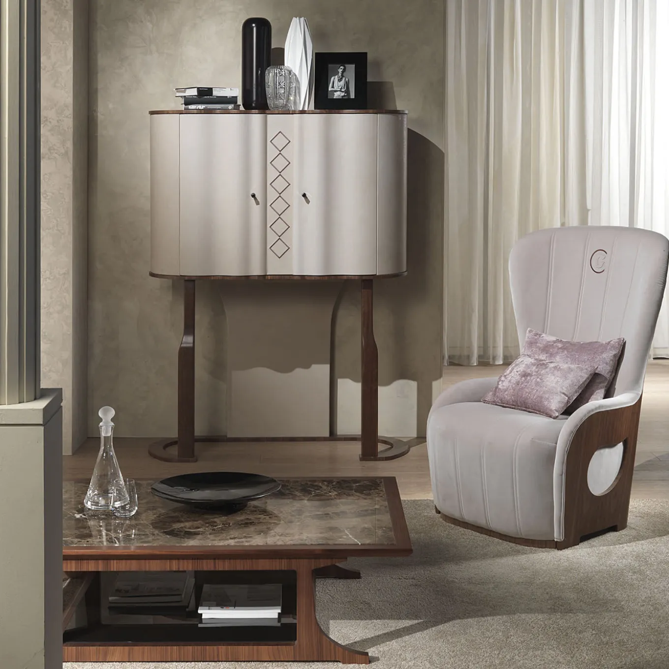 Da una collezione boutique di pezzi complementari, il mobile bar Mistral è caratterizzato dalle onde tipiche della collezione. Realizzato in noce canaletto, il mobile bar è rivestito in morbida pelle di nabuk e arricchito da dettagli geometrici. Il mobile è completo di illuminazione per garantire un facile accesso alle bottiglie durante gli intrattenimenti.