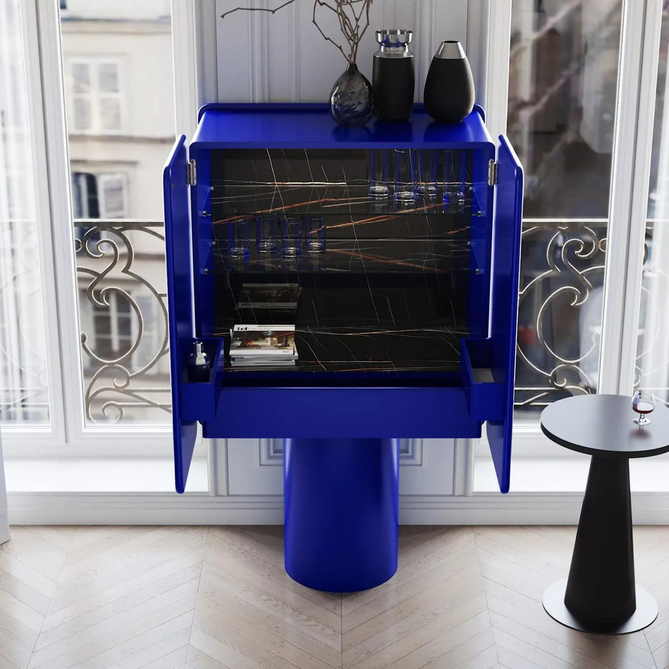Eccentrico e grazioso nella sua sapiente combinazione di blu oltremare e profili armoniosi, questo mobile bar emana un fascino glamour. Un’audace gamba cilindrica sostiene il mobile contenitore, le cui ante – decorate con inserti in ceramica demi-lune che imitano il prezioso marmo Sahara Noir – si aprono per rivelare l’esclusiva dotazione interna composta da un cassetto, uno specchio, ripiani in vetro e tasche laterali. Un complesso sistema di illuminazione a LED completa il design.