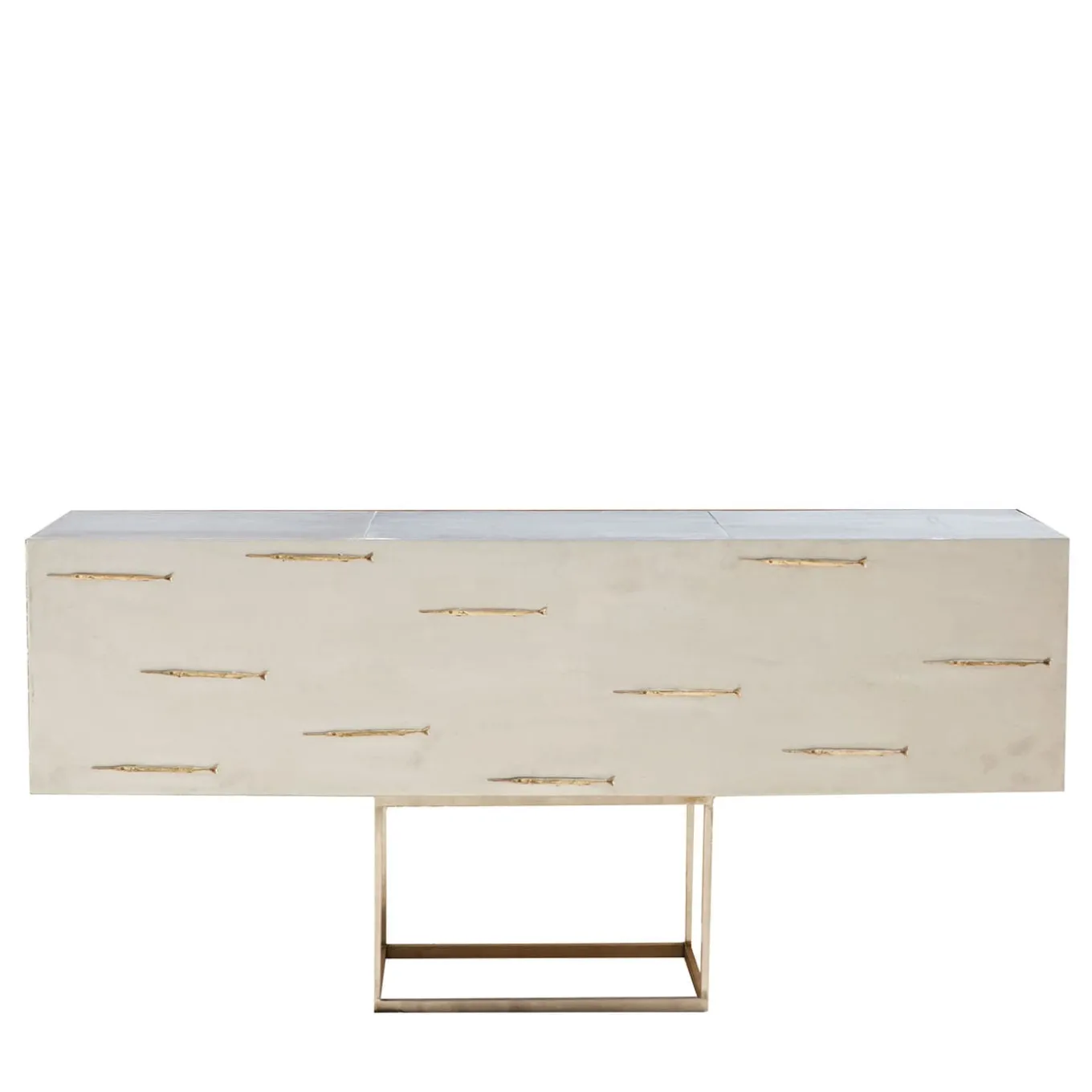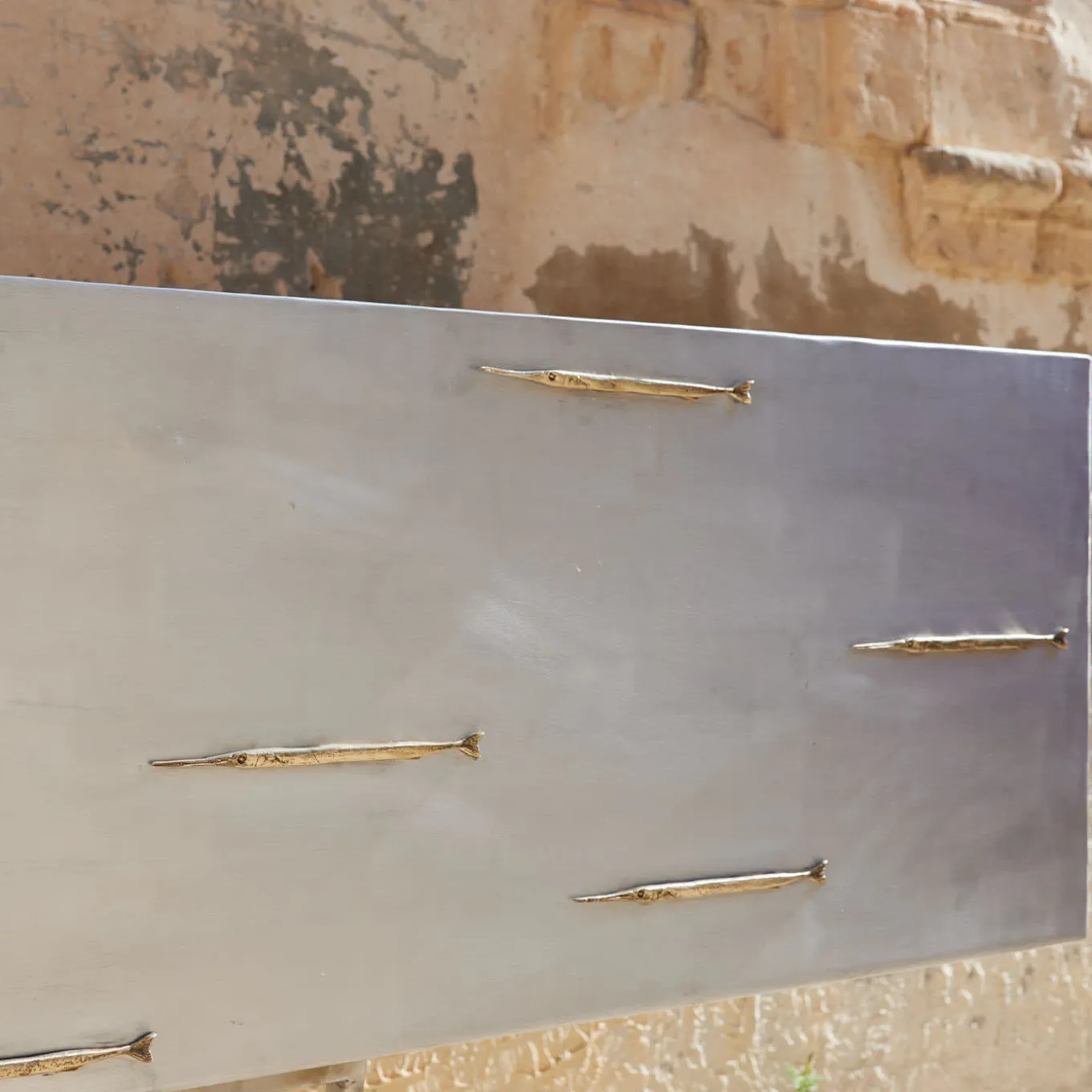 Un mobile in alluminio con inserti di pesci ad ago in bronzo realizzati con la tecnica della cera persa. Ispirato alla serie pittorica dei sognatori con pesci di Fiorentino. Come per gli altri mobili e sculture di Fiorentino, l’oggetto è di per sé un segreto, che una volta trovato apre la credenza e fa emergere il blu. In ogni pezzo, un’aguglia diversa apre il vano segreto all’interno della credenza.