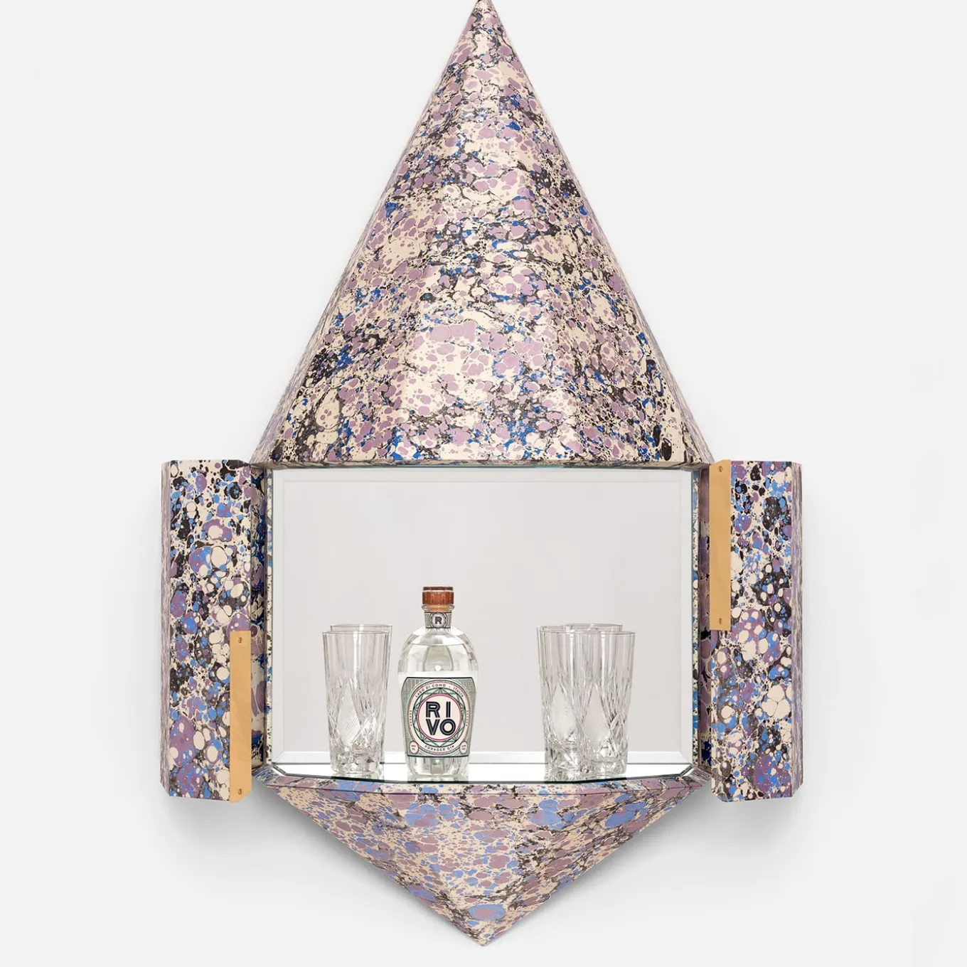 Questo elemento nasce dall’unione di riferimenti dal significato profondo: tabernacoli e pietre preziose. Realizzato in legno, è un mobile che vuole diventare il custode delle piccole gioie domestiche e dei riti quotidiani. L’esterno è rivestito di carta di cotone marmorizzata, realizzata a mano da esperti artigiani umbri, mentre l’interno è rivestito di ottone lucido e specchi, capaci di esaltarne il contenuto. Può essere declinato in molti modi, da altare domestico a mobile bar.