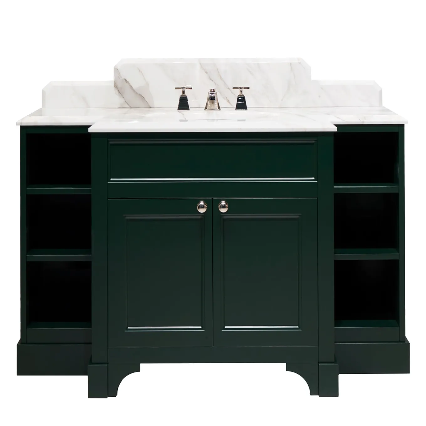 Un mobile portalavabo per sale da bagno di impeccabile eleganza, caratterizzato da un design essenziale che distilla la bellezza senza tempo dello stile neoclassico. Il mobile portalavabo è composta da un top e l’alzatina in marmo Bianco di Carrara, i pomelli di ottone e la struttura in legno laccato English Green. La rubinetteria non è inclusa. Contattare il Concierge per ulteriori informazioni e opzioni.