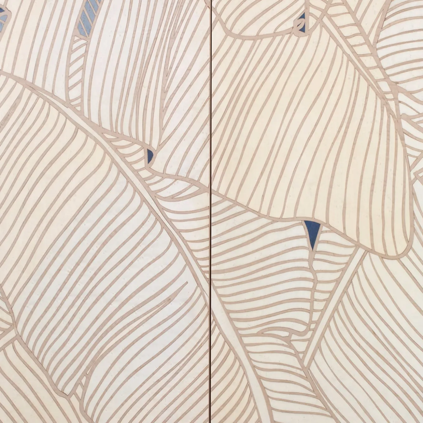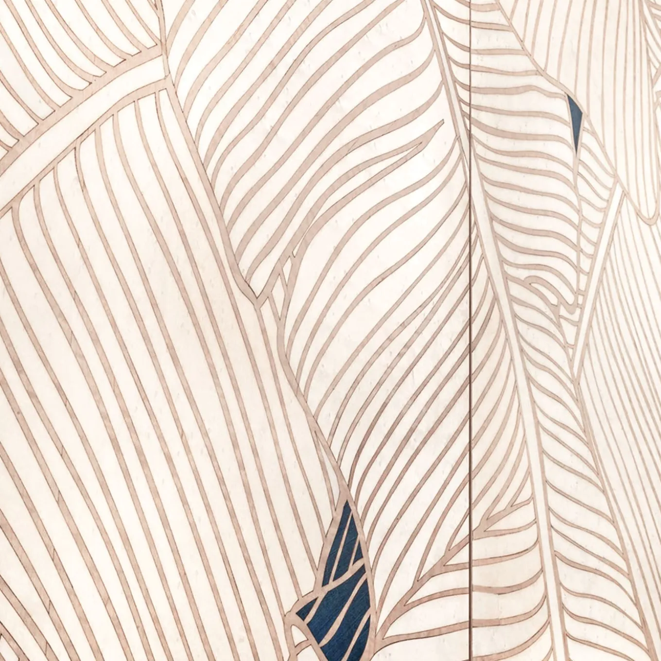 Caratterizzato da una deliziosa tavolozza di colori bianchi e azzurri, questo mobile si ispira all’irraggiungibile perfezione della natura. Poggia su sottili gambe metalliche, creando un piacevole gioco di pieni e vuoti con il mobile contenitore sovrastante, realizzato in cedro laccato blu cielo. Un intarsio minuziosamente lavorato a mano che raffigura le foglie di Musa Basjoo nella loro bellezza organica e spontanea completa il pezzo.