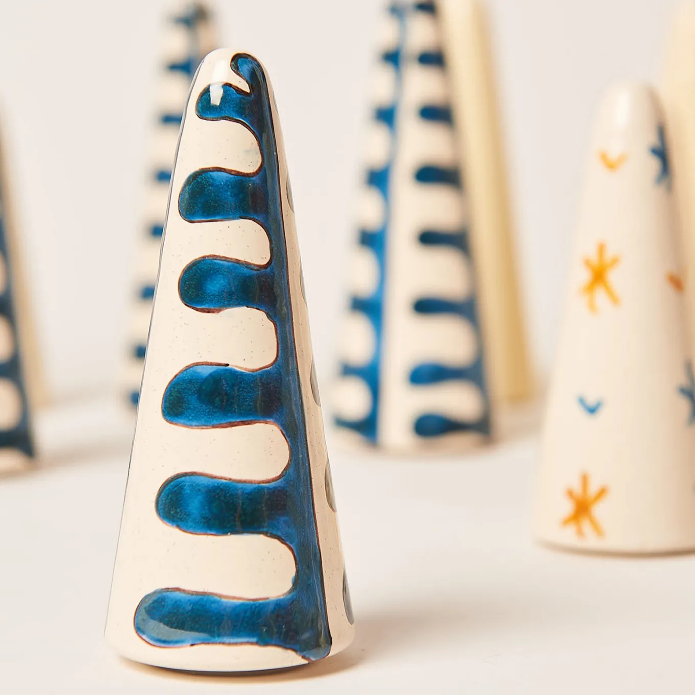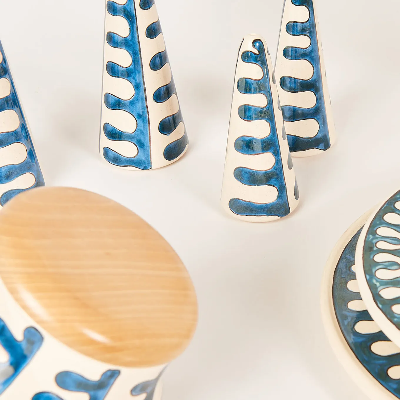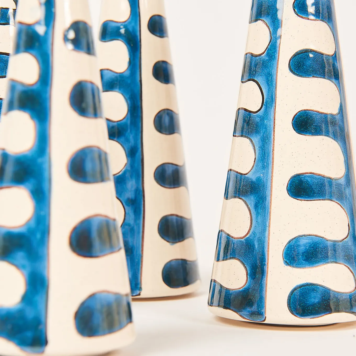 Questo raffinato set di sali e pepiere è realizzato in argilla bianca con uno stampo in gesso e presenta una decorazione ispirata al motivo della “zaffera a rilievo”, caratteristico dell’arte ceramica toscana del XV secolo. Un pezzo unico di arte artigianale, con uno smalto blu cobalto interamente dipinto a mano su smalto bianco. I pezzi misurano (in cm): H 17 x Ø 6,5 e H 12,5 x Ø 5,5.
