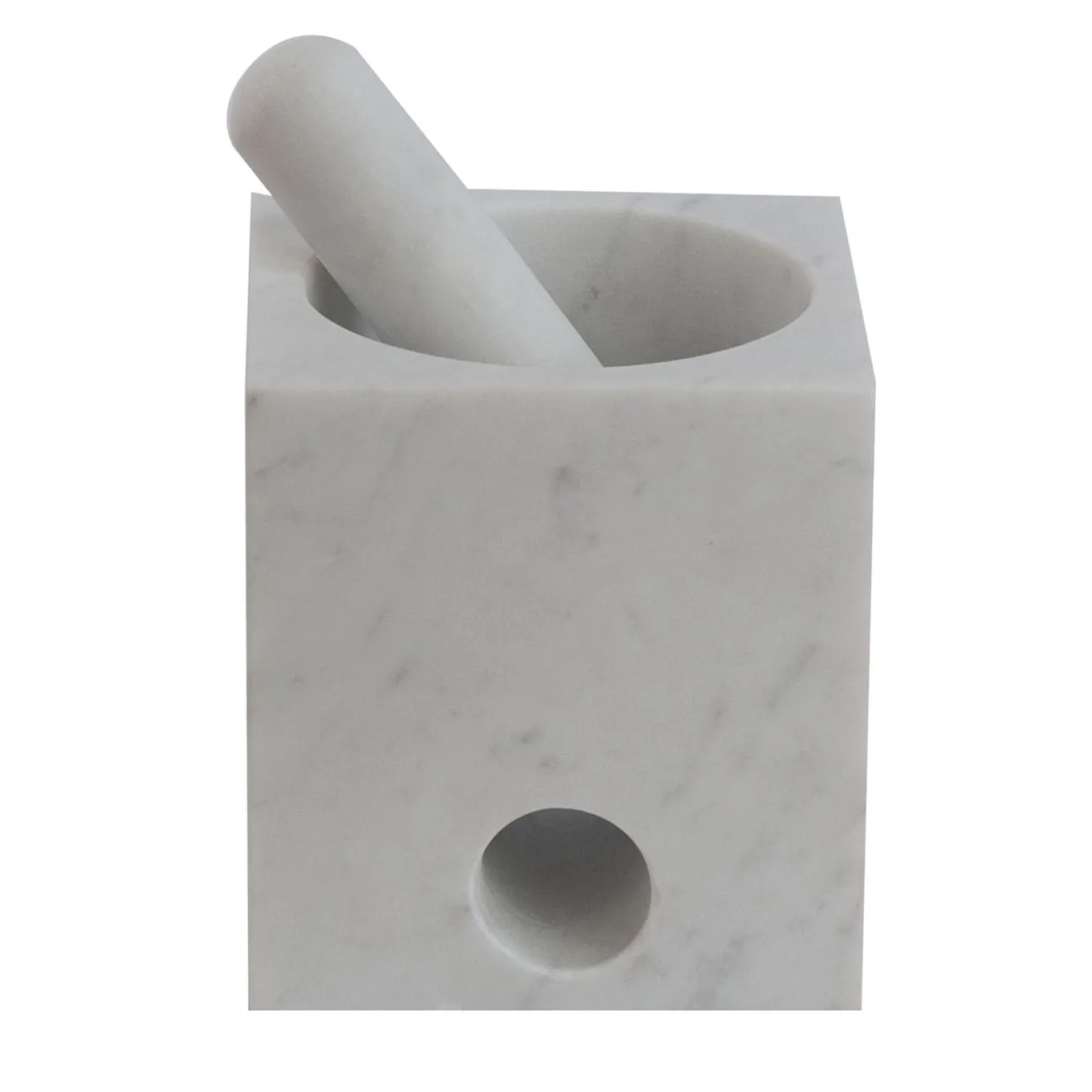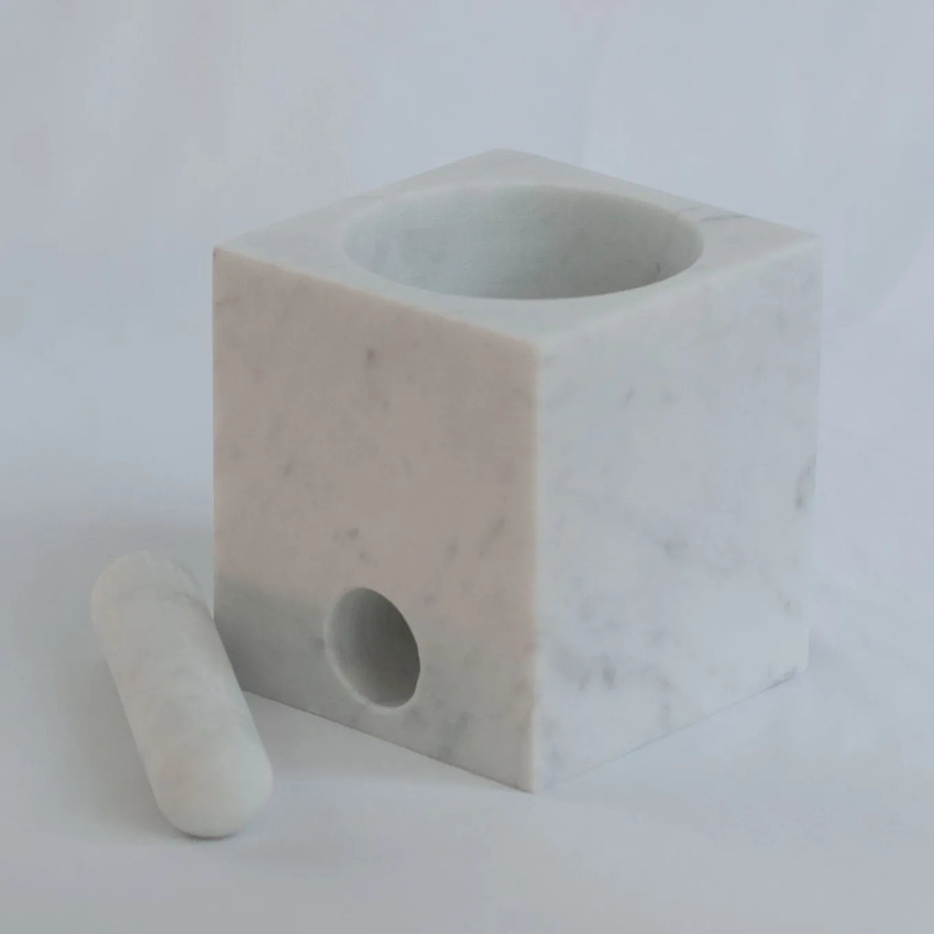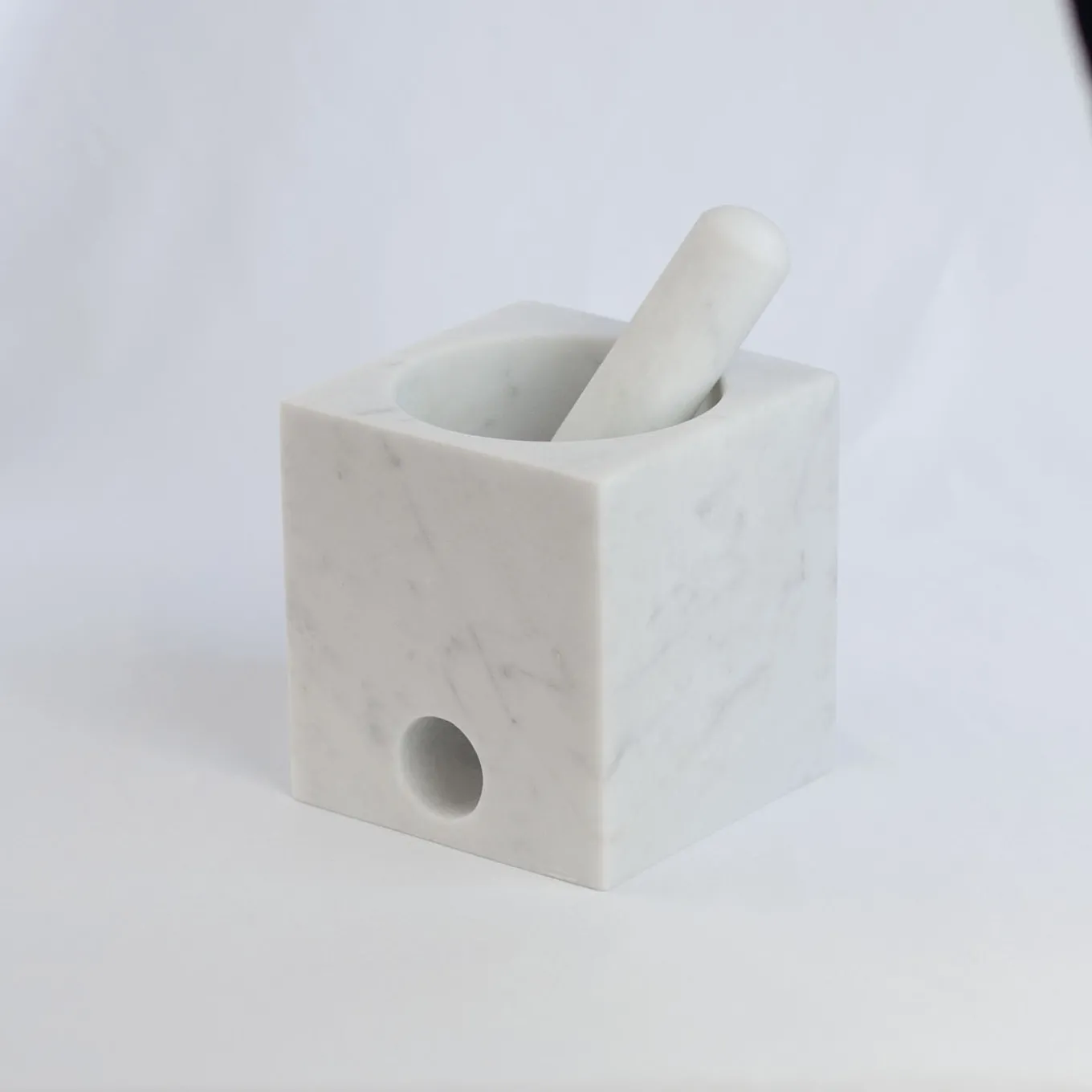 Una moderna reinterpretazione del classico mortaio e pestello caratterizzato da geometrie minimaliste che enfatizzano la purezza del materiale. Il mortaio è realizzato con un foro alla base per supportare e bloccare il pestello, valorizzando l’estetica del blocco scultoreo. Realizzato in marmo bianco di Carrara con finitura satinata, questo accessorio da cucina di medie dimensioni combina funzionalità con un design raffinato.