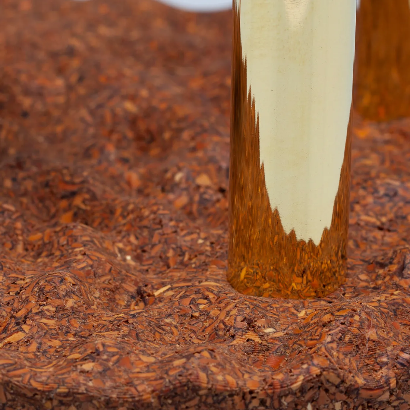 Questa suggestiva scultura di Marta Laudani simboleggia l’essenza primordiale della natura, dove un paesaggio stilizzato di elementi “inanimati” in ottone spuntano come piante da una zolla rappresentata da una base di forma irregolare in Keep Life®. Due piccoli tubi, uno specchio montato con un angolo di 90° su un’asta sottile con una piastra rotonda, sono inseriti nella base rotonda, pronti per essere completati da elementi naturali “vivi” come fiori, pietre e conchiglie.