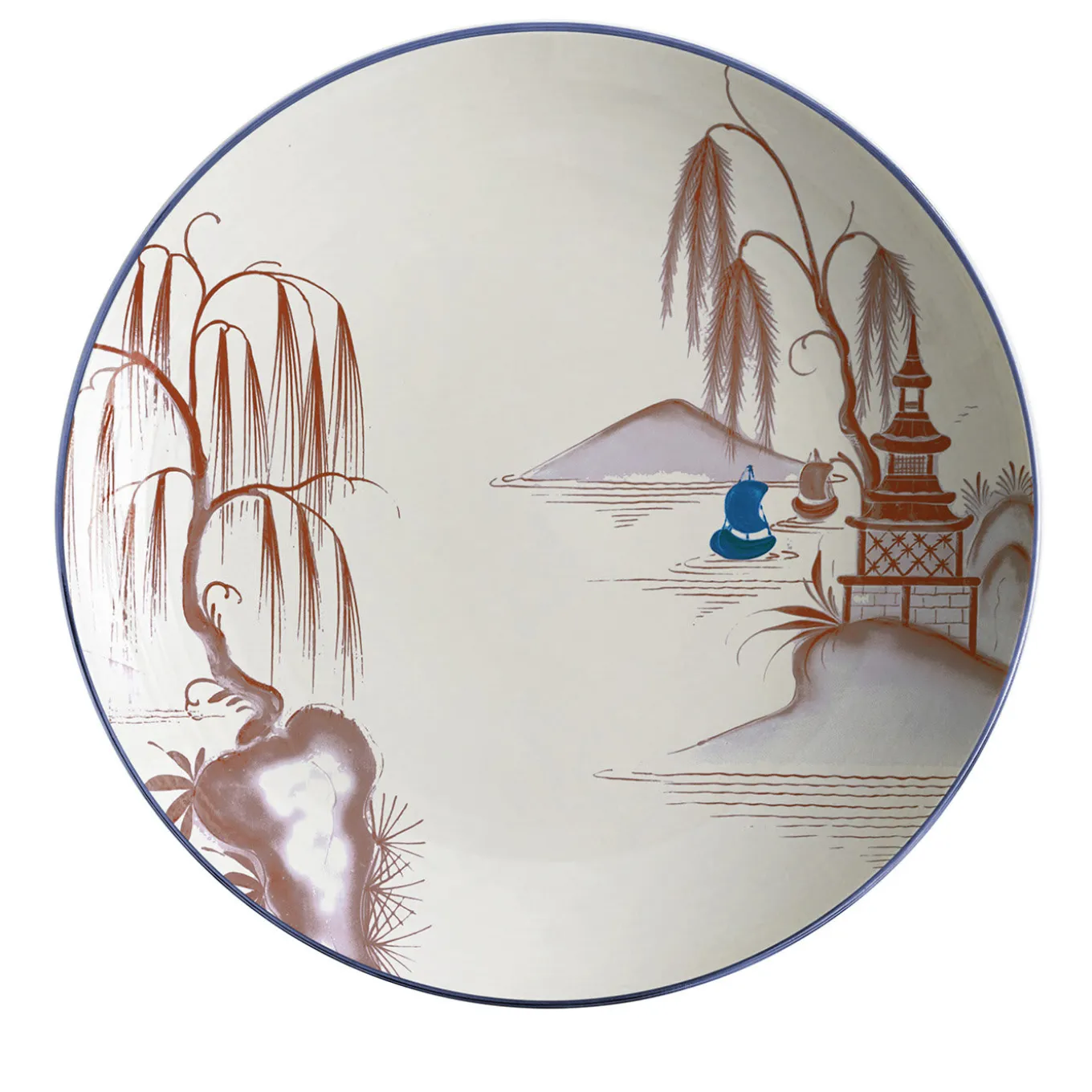 Un paesaggio giapponese straordinariamente grazioso orna questo piatto fondo in porcellana lavorato a mano dall’artista Vito Nesta. Rendendo omaggio al tradizionale motivo Imari giapponese della tavolozza a tre colori, lo squisito avorio e il delicato rosso dominano questa scena pacifica. Un singolo accento di blu cobalto compare su una nave e sul bordo del piatto.