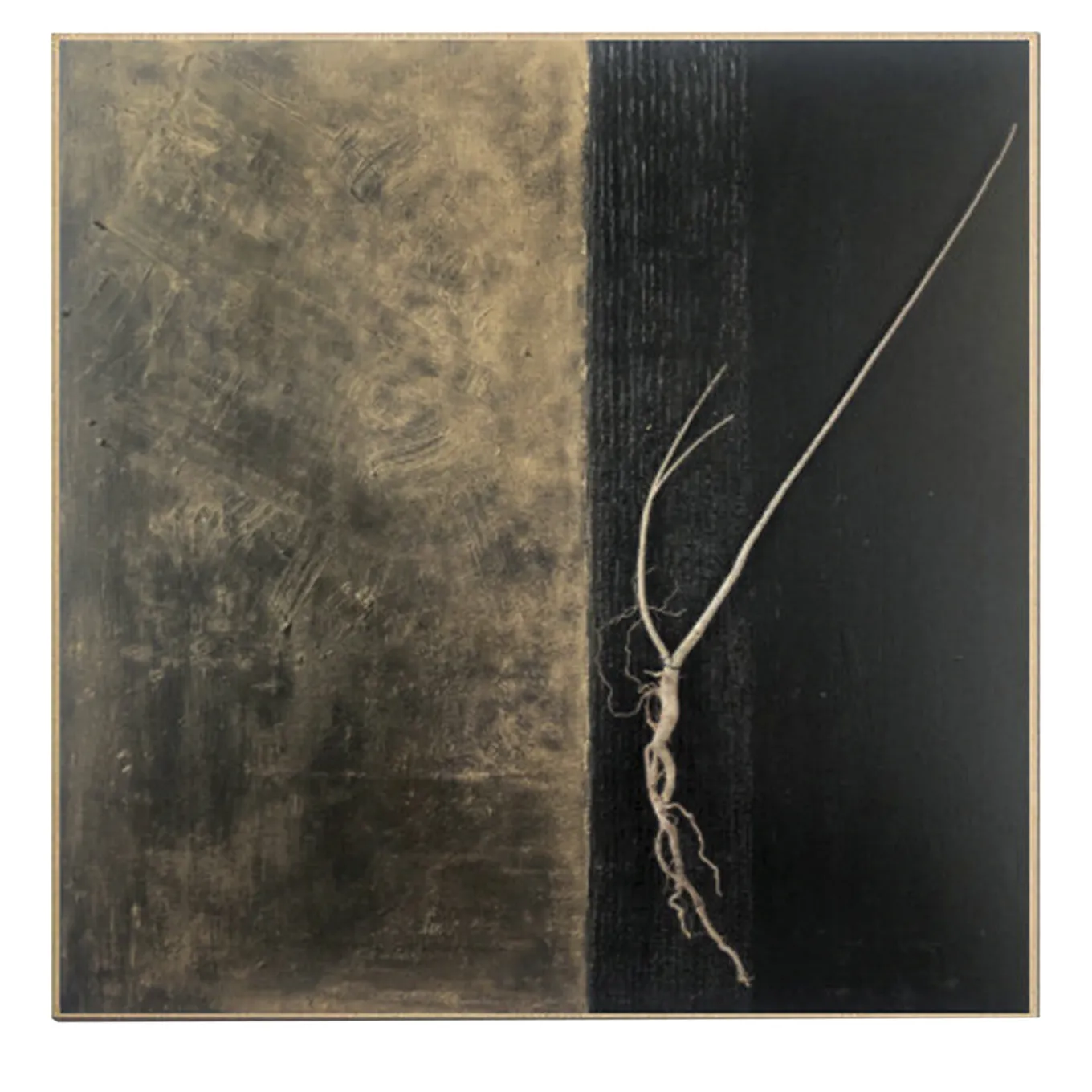 Intenso, evocativo e contraddittorio – proprio come New York – questo quadro lusinghiero appartiene alla collezione Naturalia et Mirabilia. Realizzata con le tecniche dell’acrilico e dell’olio su tela, quest’opera si distingue per il netto contrasto cromatico tra la metà destra e quella sinistra, che risulta comunque in un delicato equilibrio grazie al ramoscello cucito a mano sul ricco sfondo nero.
