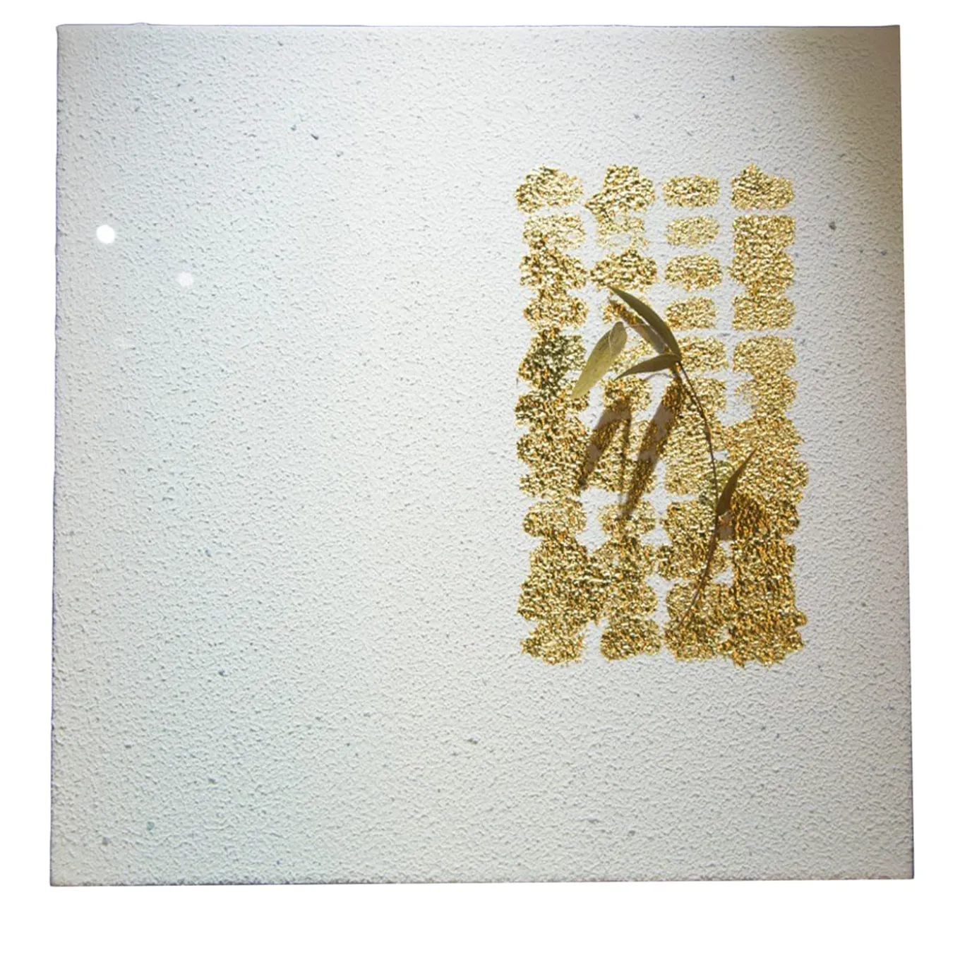Questo dipinto unico, che fa parte della Collezione Naturalia di opere d’arte esposte al Museo Archeologico Nazionale della Sibaritide, evoca la pace attraverso uno dei suoi simboli più famosi: l’ulivo. Un ramoscello d’ulivo emerge da una decorazione screziata e scintillante, che interrompe la raffinata texture bianca e bugnata con cui la tela è decorata dalla mescolanza dei materiali.
