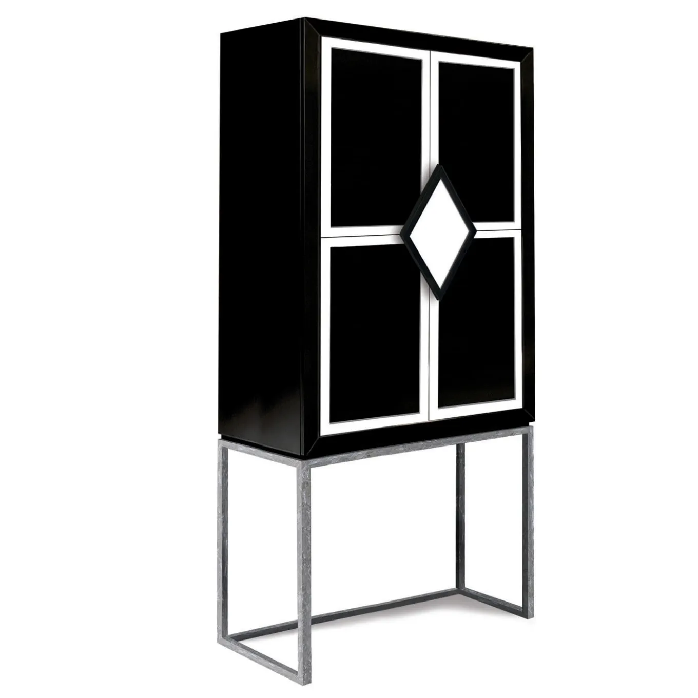 Questo armadietto a due ante, splendidamente realizzato dai migliori artigiani italiani, poggia su una struttura metallica in foglia d’argento ed è rifinito con un’elegante laccatura nera lucida. La finitura laccata in bianco e nero e la maniglia in legno a forma di rombo aggiungono drammaticità e raffinatezza. Ideale per conservare bottiglie e bicchieri, il mobile è dotato di due ripiani in vetro e di uno sfondo a specchio. Designer: Isabella Costantini.