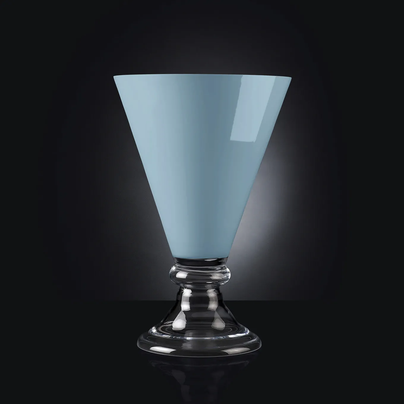 Un superbo gioco di linee pulite ed eleganti e di tonalità delicate e lucide, questo vaso fa parte di una serie versatile e senza tempo, adatta ad arredamenti moderni o classici. Realizzato magistralmente a mano da esperti artigiani, presenta una base rotonda in vetro trasparente che sostiene una sommità blu a forma di cono.