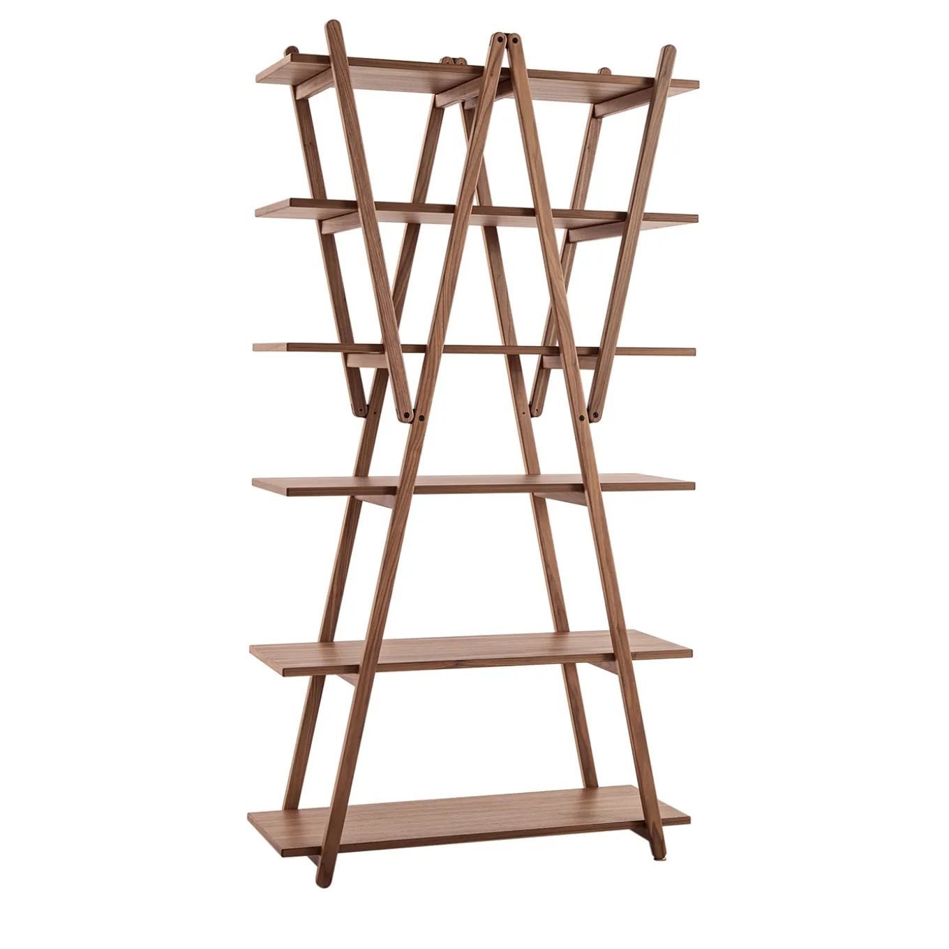 Nuvola Rossa – Libreria. Disegnata da Vico Magistretti, questa libreria dalle linee semplici e pulite nasce da un’attenta analisi del modello classico con supporti laterali e ripiani. Si tratta di un’icona del design, ma anche di una vera e propria invenzione costruttiva: i puntoni diagonali diventano la struttura portante e ospitano i ripiani, eliminando la necessità di supporti laterali. Ponendo l’accento sulle cerniere e sui sei ripiani, la struttura, ripiegabile, può essere utilizzata anche come divisorio. La sua estetica elegante e primaria, senza tempo e di facile lettura, ha reso Nuvola Rossa un’icona indiscussa del design fin dal 1977. È stata più volte imitata come esempio di funzione semplificata ottenuta attraverso un gioco di forme.