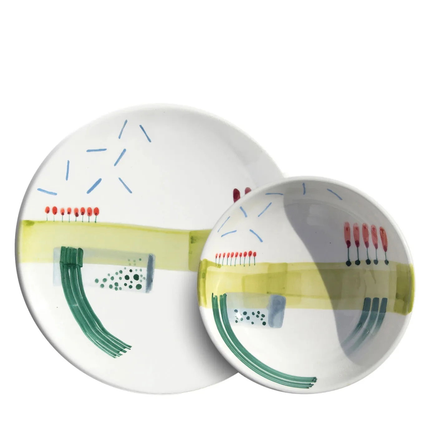 Questo set di due piatti da portata e da zuppa è uno dei disegni della collezione Divertissement. I disegni su questi piatti guardano al paesaggio emiliano fatto di alberi alti e piccoli fiumi. Ogni pezzo è unico e dipinto interamente a mano, il disegno può variare leggermente. Per ulteriori informazioni e opzioni, contattare il Concierge.