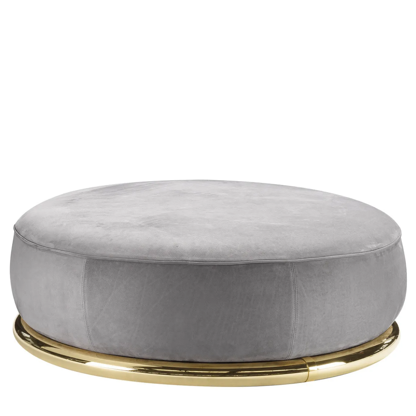 Interpretazione moderna delle forme iconiche e slanciate di un pouf classico, questo magnifico pezzo sfoggia una silhouette rotonda interamente rivestita in pregiata pelle grigia. Perfettamente abbinato al divano grigio della serie Abbracci, creerà un angolo di relax accogliente e confortevole in qualsiasi casa moderna o tradizionale. Il pezzo poggia su una robusta base in ottone lucidato in oro. Per il mercato statunitense, contattare il Concierge per i tessuti certificati CAL TB 117.