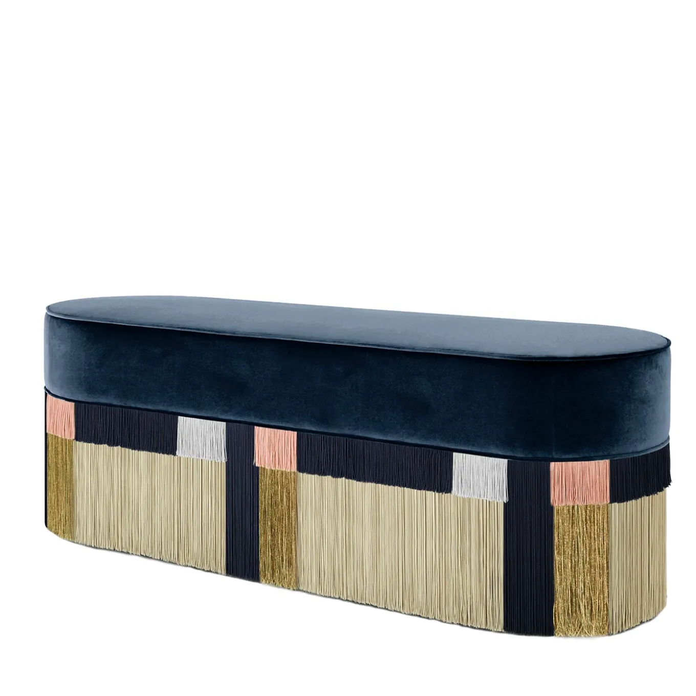Una serie di frange di viscosa, assortite per dimensioni e colori e avvolte attorno a un’armoniosa base laccata, creano il sorprendente motivo geometrico che caratterizza questa panca allungata. Un’aggiunta elegante alla fine di un letto matrimoniale, il pezzo è sigillato da una morbida seduta rivestita di velluto in una regale tonalità blu. Contattare il Concierge per le opzioni di personalizzazione e i prezzi. Ogni pezzo su misura è stampato sul fondo della fodera del pouf e firmato, numerato e datato personalmente dal designer.