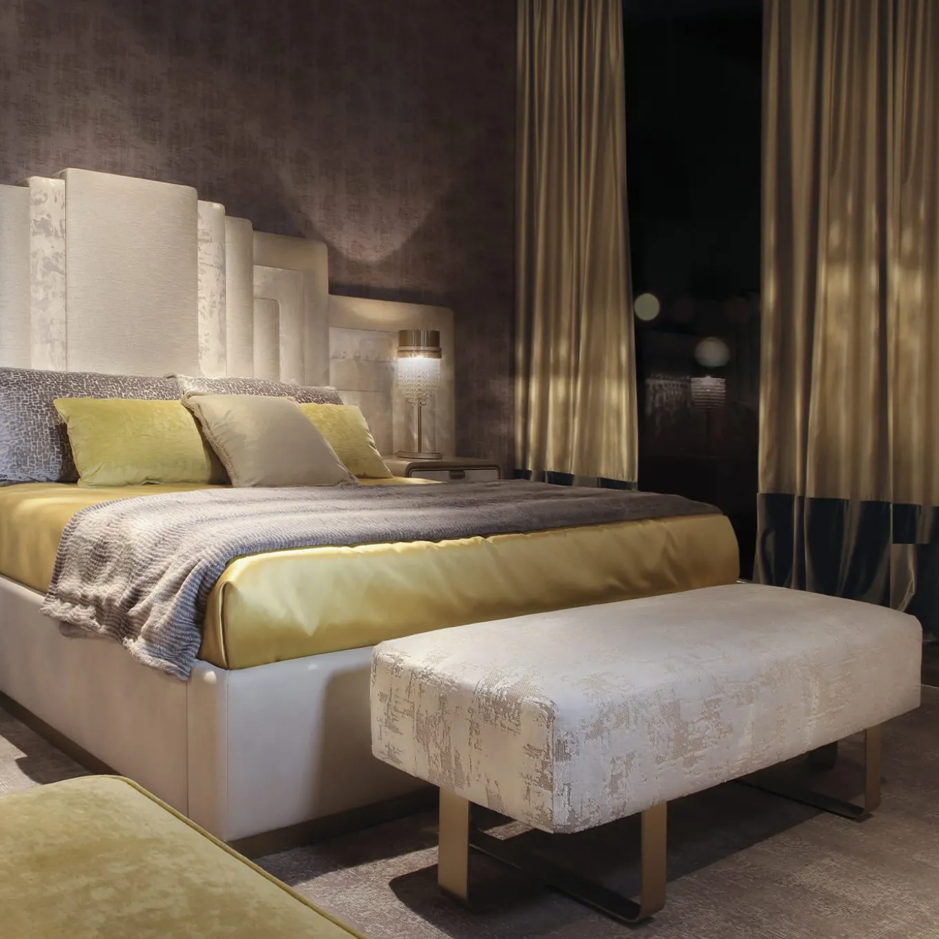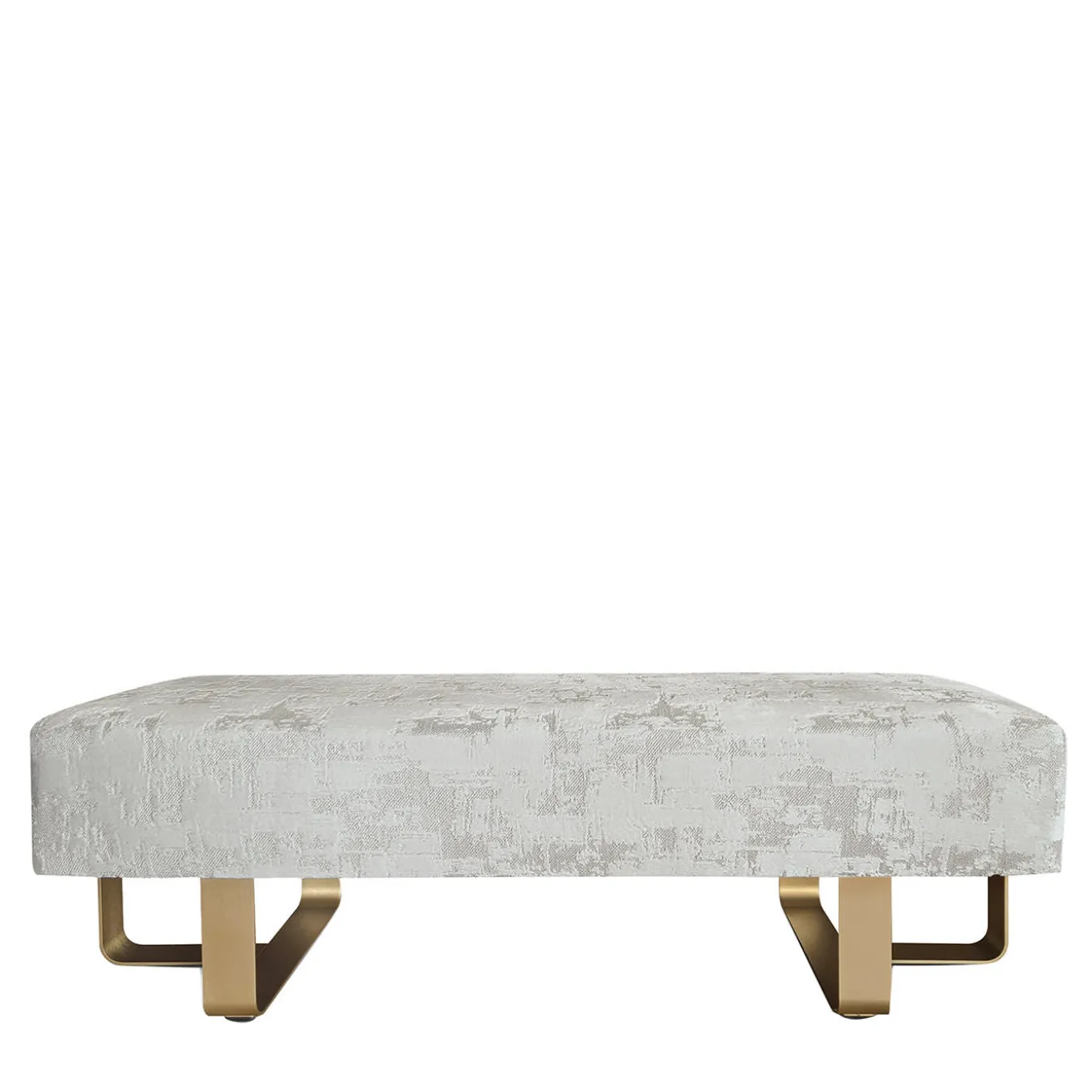 Panca della collezione Hanami. Struttura imbottita con rivestimento in tessuto. Piedi in metallo massiccio con finitura satinata oro. Chiedere al concierge per le opzioni di personalizzazione.
