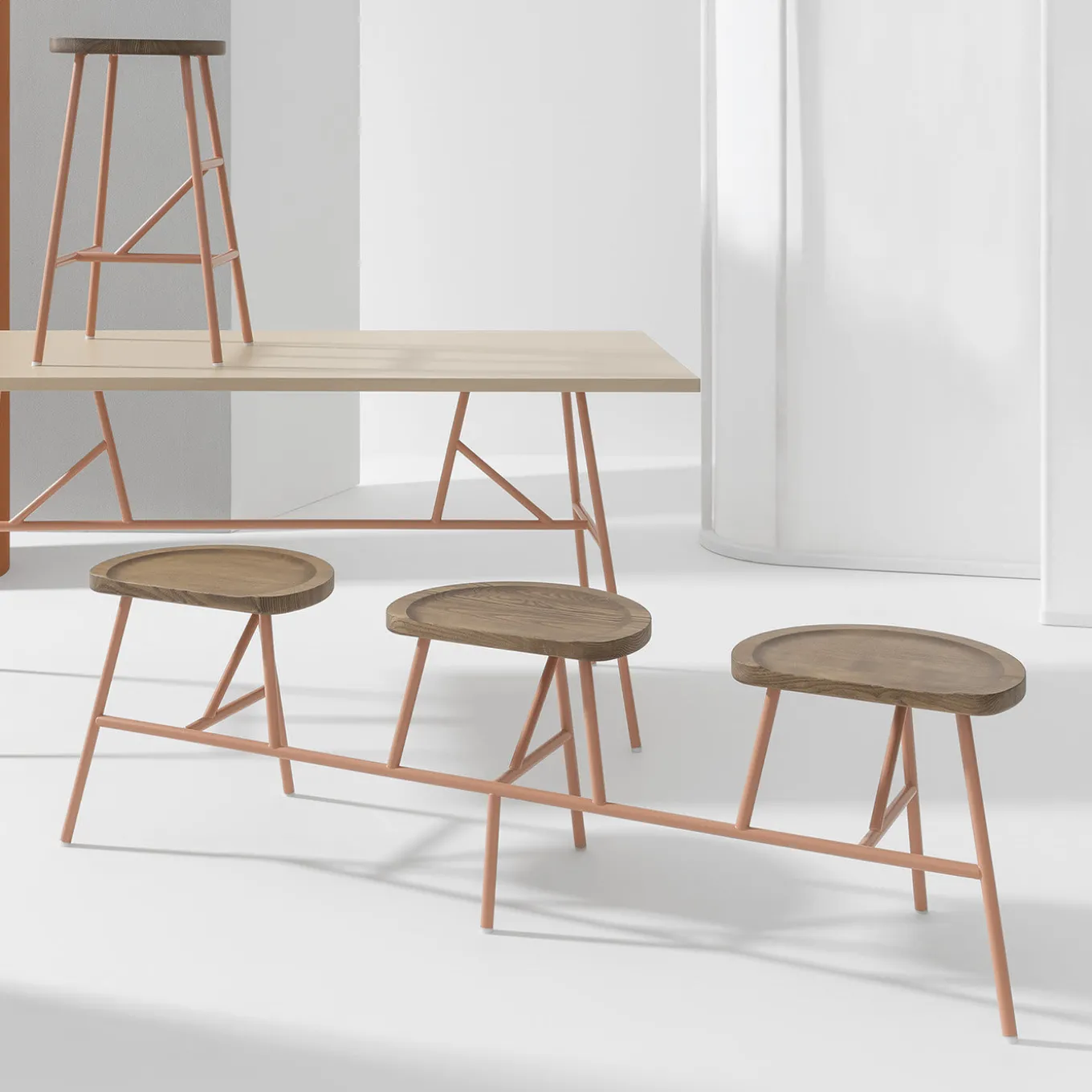 Questo esclusivo progetto di Emilio Nanni, che trasmette un senso di leggerezza e fascino senza sforzo, trae ispirazione dallo sgabello e lo reinterpreta in molteplici versioni che si integrano con gli arredi commerciali e residenziali. La struttura cilindrica in acciaio laccato in tonalità tabacco chiaro sostiene con grazia le tre sedute separate, ciascuna di forma semicircolare e realizzate in frassino tinto in marrone mogano.