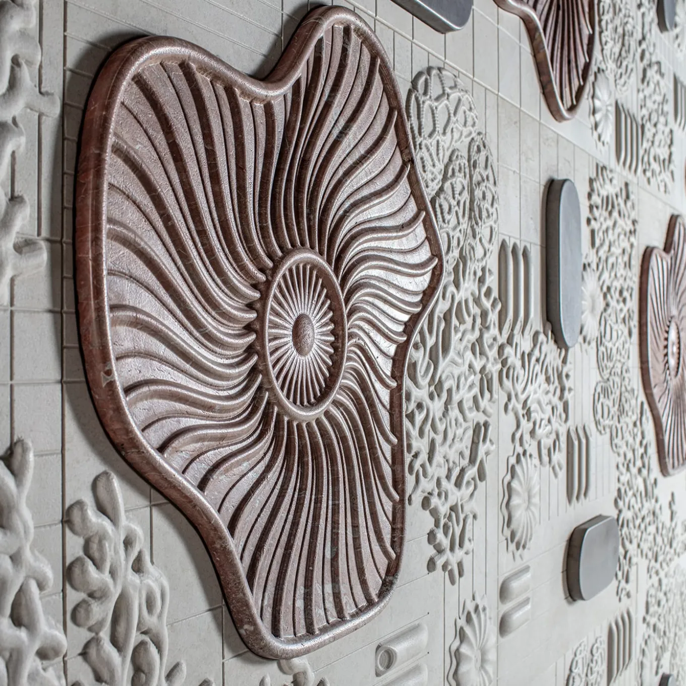 La collezione Anemone è incentrata sul paesaggio marino. Attraverso il suo linguaggio creativo unico, Elena Salmistraro interpreta le misteriose creature che abitano le profondità marine. Anemone è un pannello decorativo modulare in marmo che stratifica piante, molluschi e organismi viventi su una griglia di coordinate geografiche, creando una composizione dinamica che si estende dai fondali marini alle sagome stilizzate delle barche.